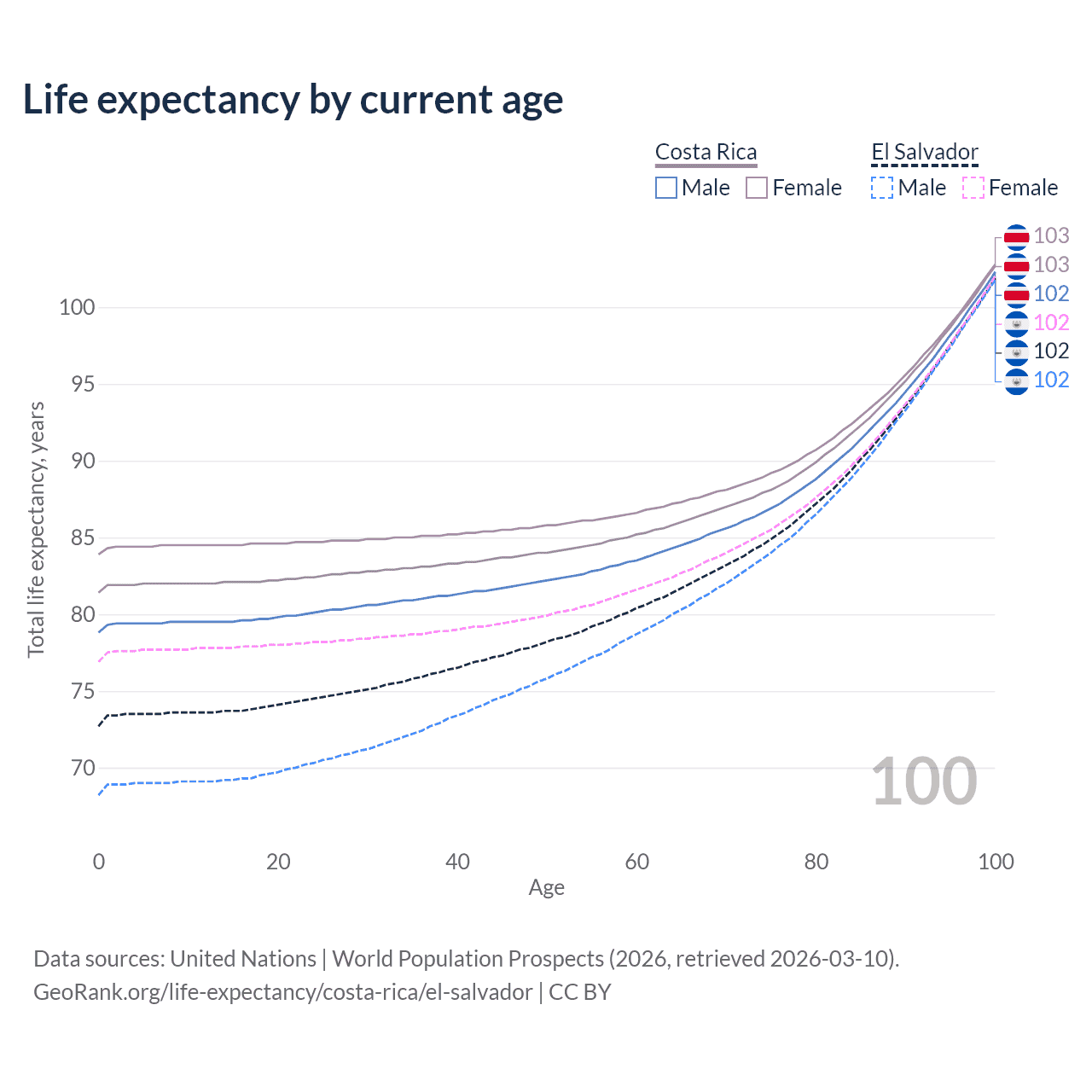This life expectancy calculator shows the odds of living to 100, 95, 90, and below based on current age for both males and females in Costa Rica and El Salvador, along with mean and median age of death. The calculations are based on the 2026 life tables (actuarial tables) from the UN World Population Prospects.