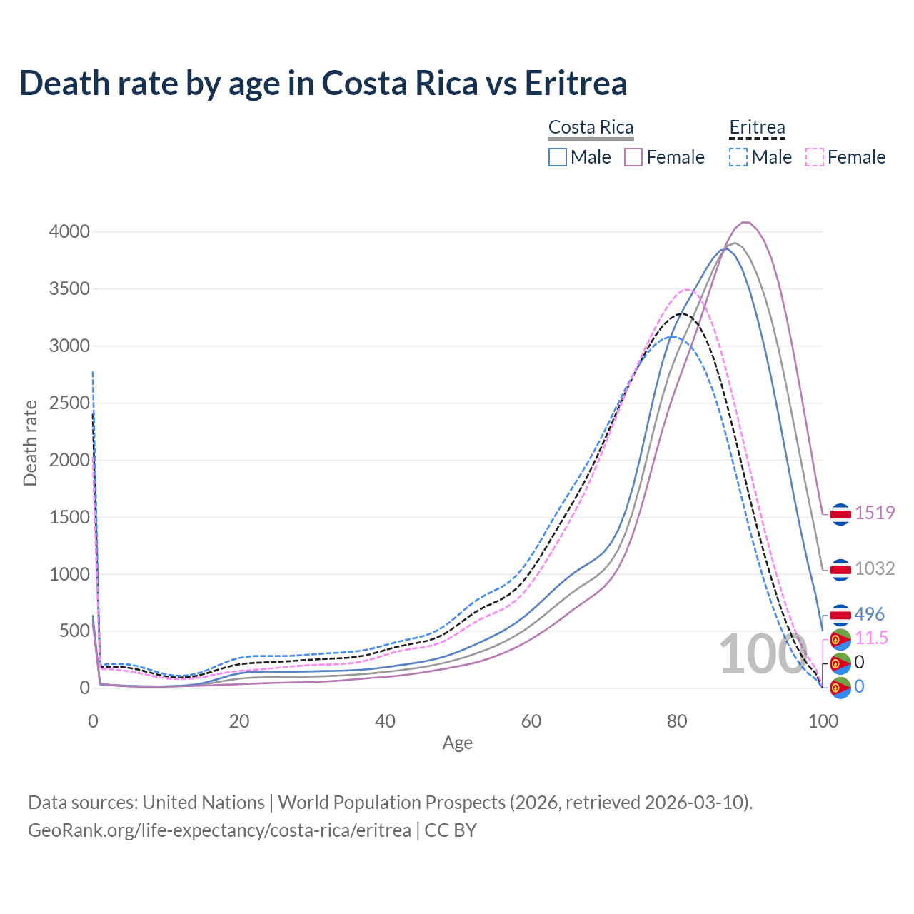 This life expectancy calculator shows the odds of living to 100, 95, 90, and below based on current age for both males and females in Costa Rica and Eritrea, along with mean and median age of death. The calculations are based on the 2026 life tables (actuarial tables) from the UN World Population Prospects.
