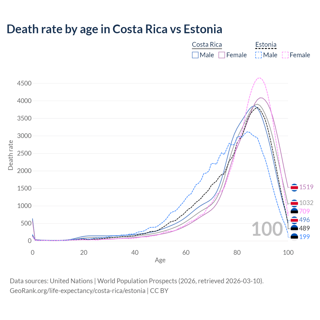 This life expectancy calculator shows the odds of living to 100, 95, 90, and below based on current age for both males and females in Costa Rica and Estonia, along with mean and median age of death. The calculations are based on the 2026 life tables (actuarial tables) from the UN World Population Prospects.