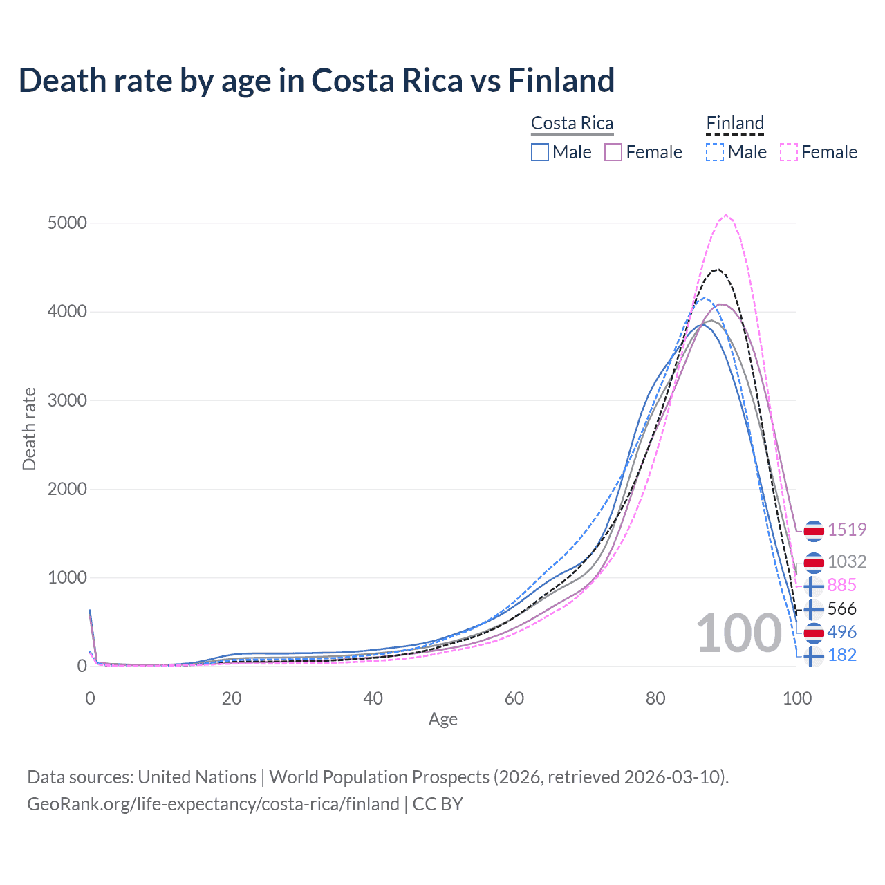 In Costa Rica, the most common age of death is 88, compared to 89 in Finland. The median age of death is 85 in Costa Rica and 85.6 in Finland, meaning only half of each cohort is expected to live past that age.