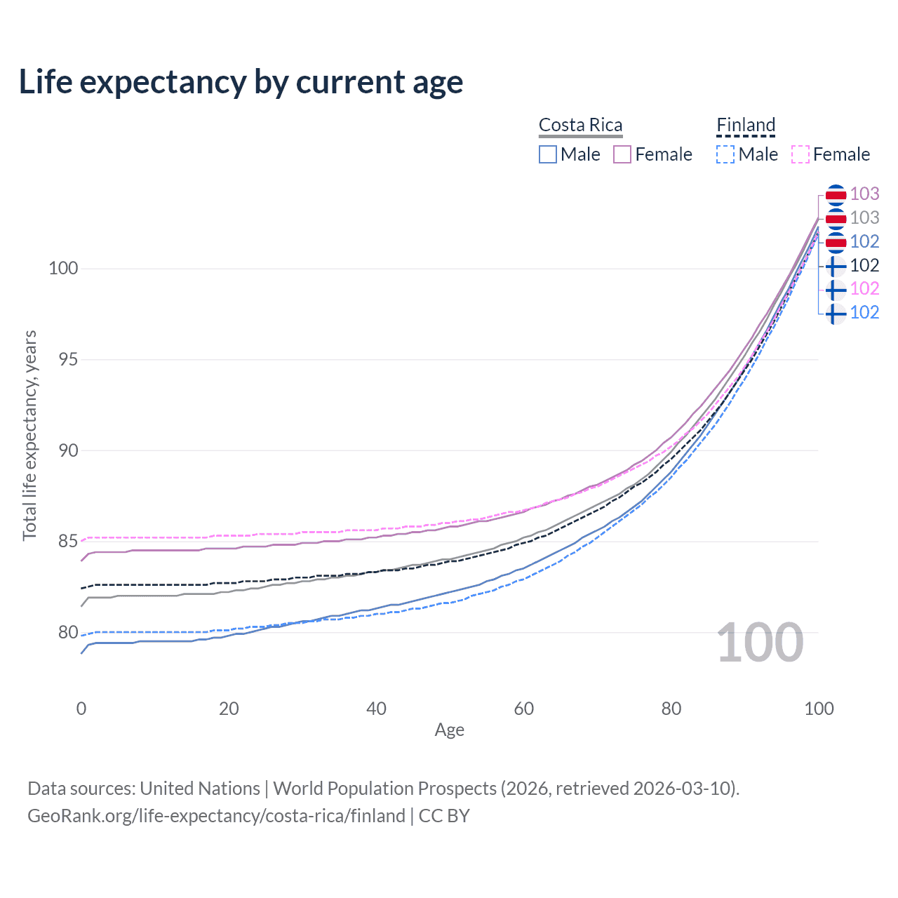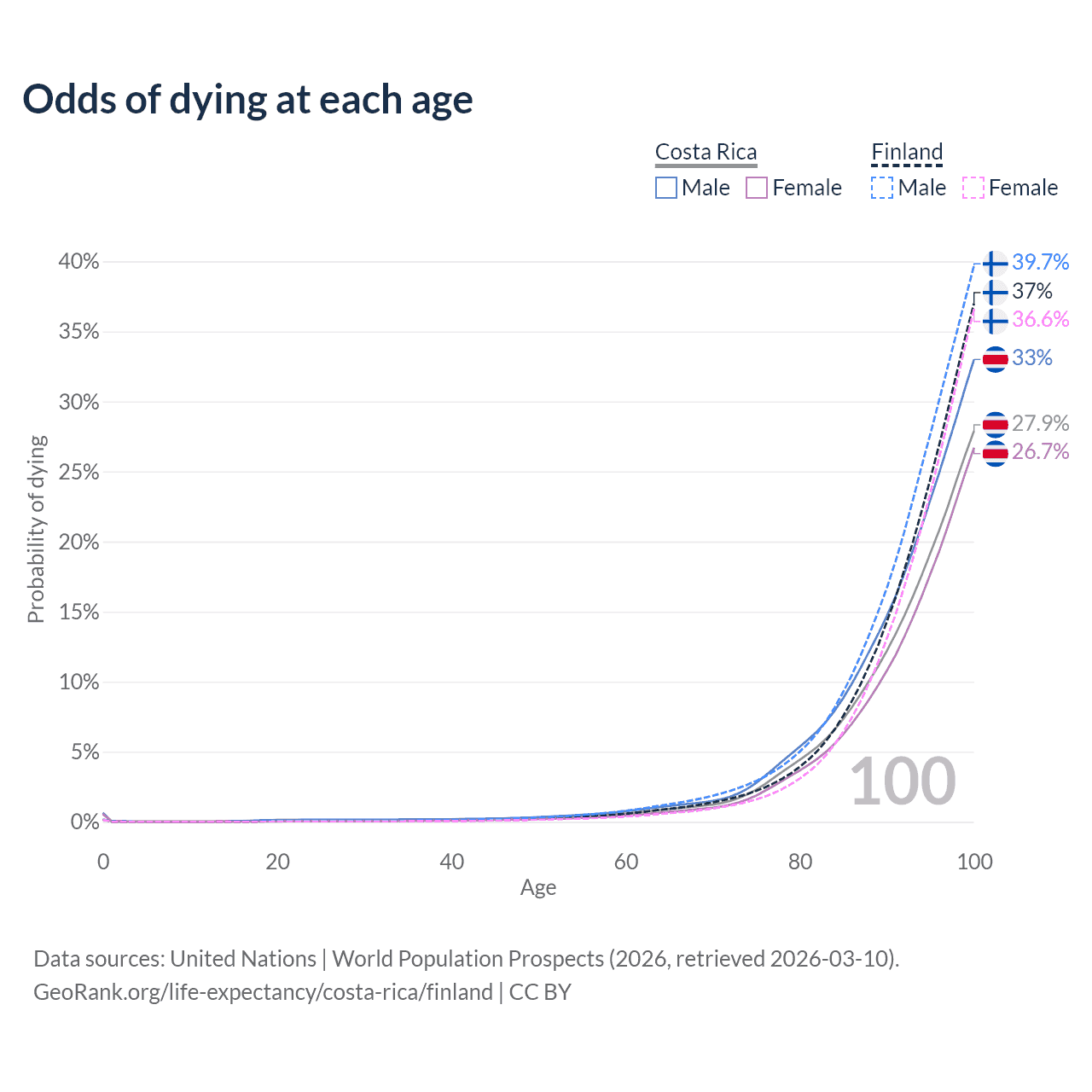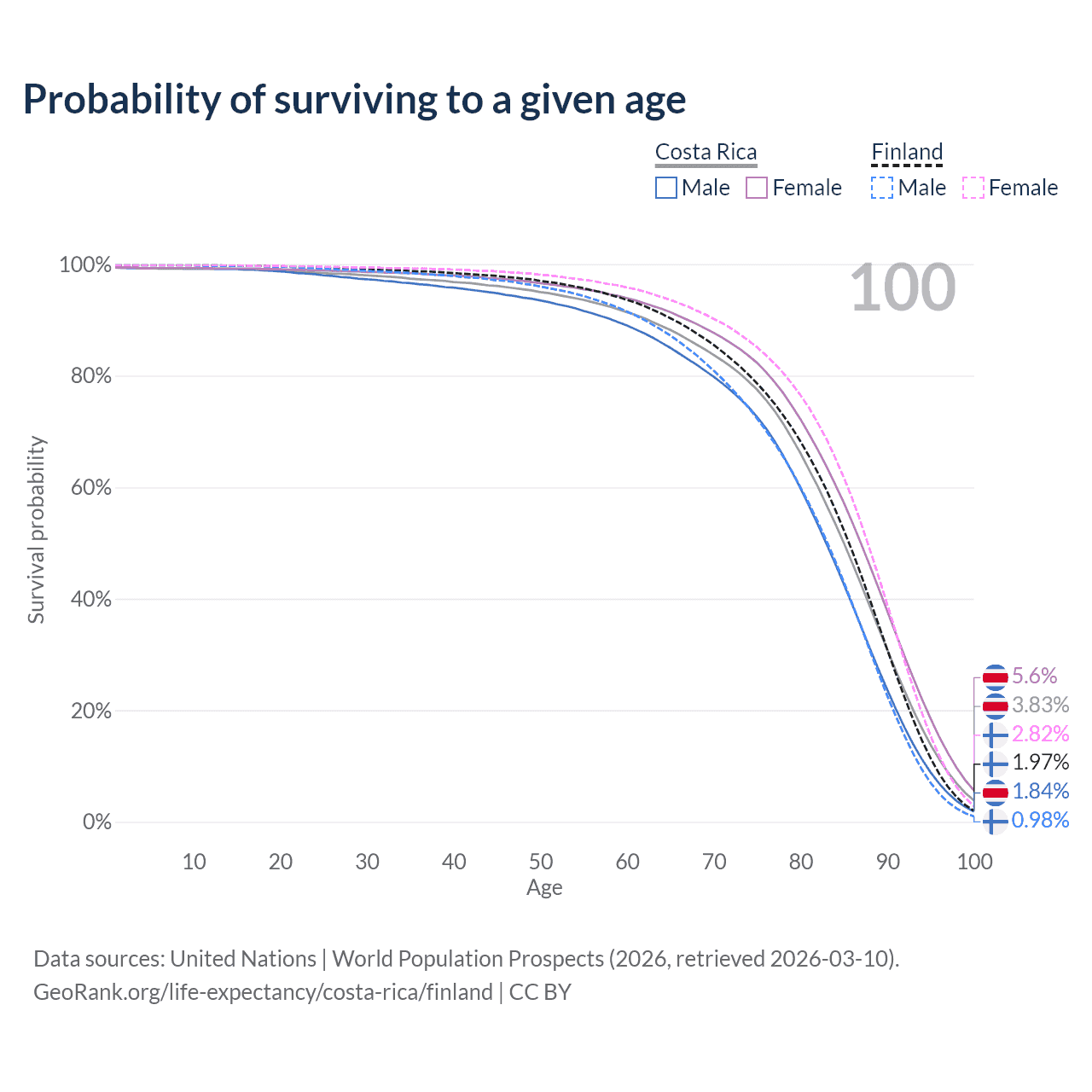 This life expectancy calculator shows the odds of living to 100, 95, 90, and below based on current age for both males and females in Costa Rica and Finland, along with mean and median age of death. The calculations are based on the 2026 life tables (actuarial tables) from the UN World Population Prospects.