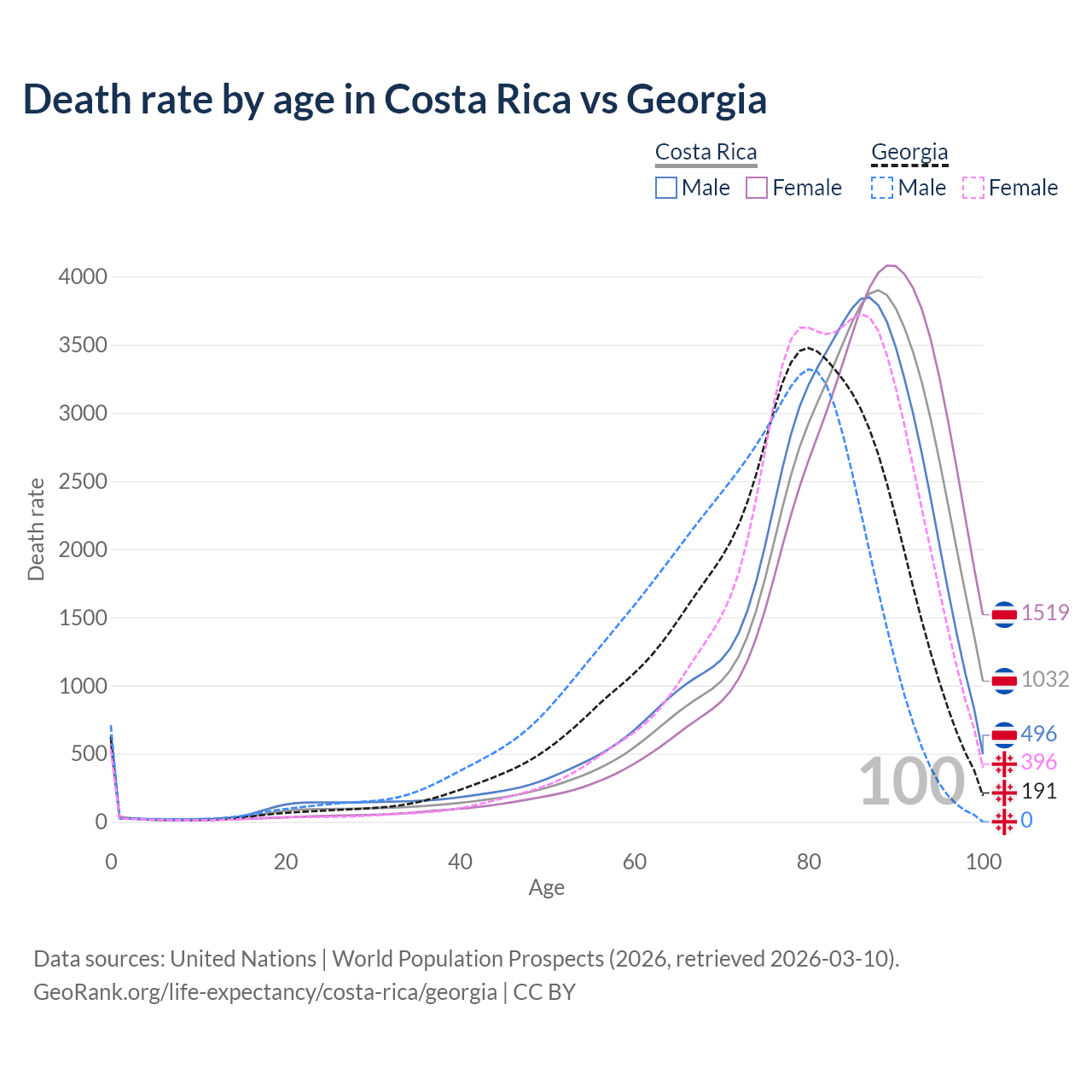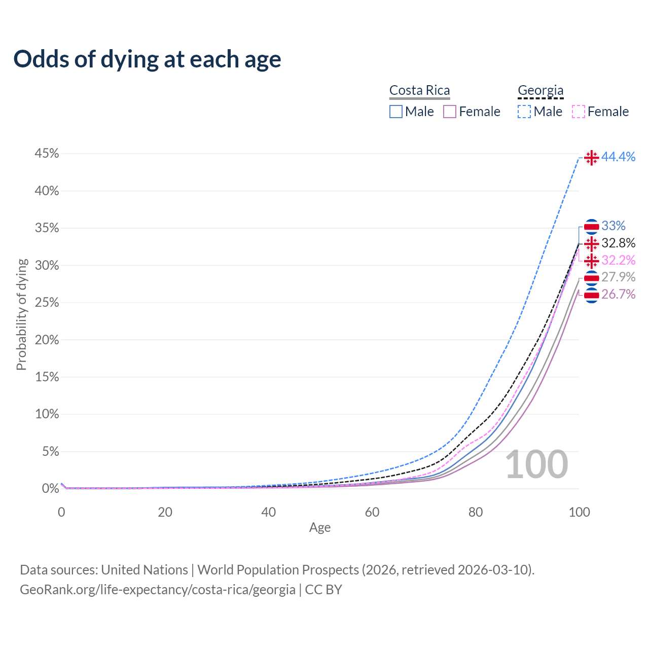 This life expectancy calculator shows the odds of living to 100, 95, 90, and below based on current age for both males and females in Costa Rica and Georgia, along with mean and median age of death. The calculations are based on the 2026 life tables (actuarial tables) from the UN World Population Prospects.