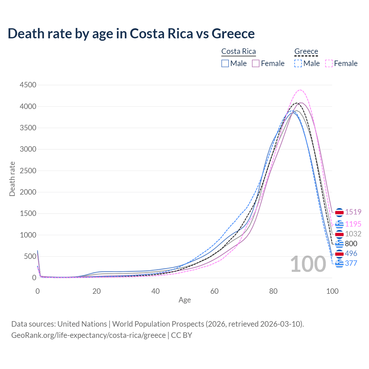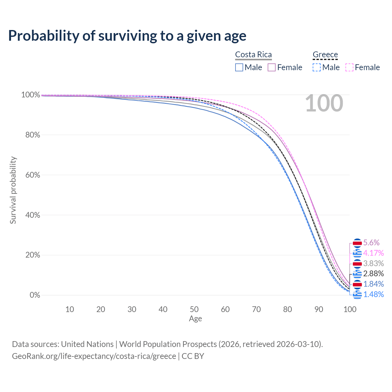 This life expectancy calculator shows the odds of living to 100, 95, 90, and below based on current age for both males and females in Costa Rica and Greece, along with mean and median age of death. The calculations are based on the 2026 life tables (actuarial tables) from the UN World Population Prospects.