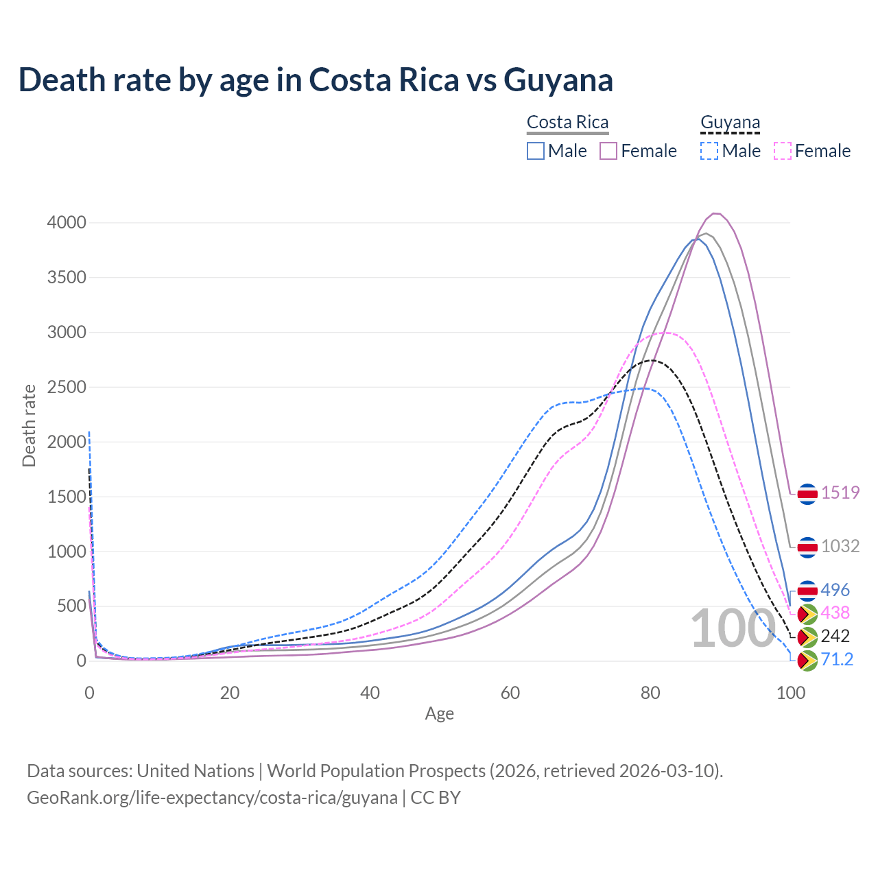 In Costa Rica, the most common age of death is 88, compared to 80 in Guyana. The median age of death is 85 in Costa Rica and 74.1 in Guyana, meaning only half of each cohort is expected to live past that age.