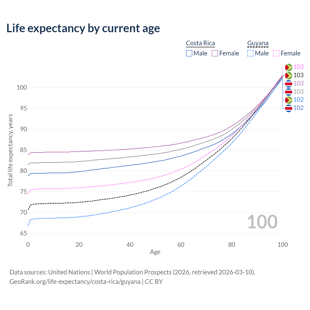 This life expectancy calculator shows the odds of living to 100, 95, 90, and below based on current age for both males and females in Costa Rica and Guyana, along with mean and median age of death. The calculations are based on the 2026 life tables (actuarial tables) from the UN World Population Prospects.