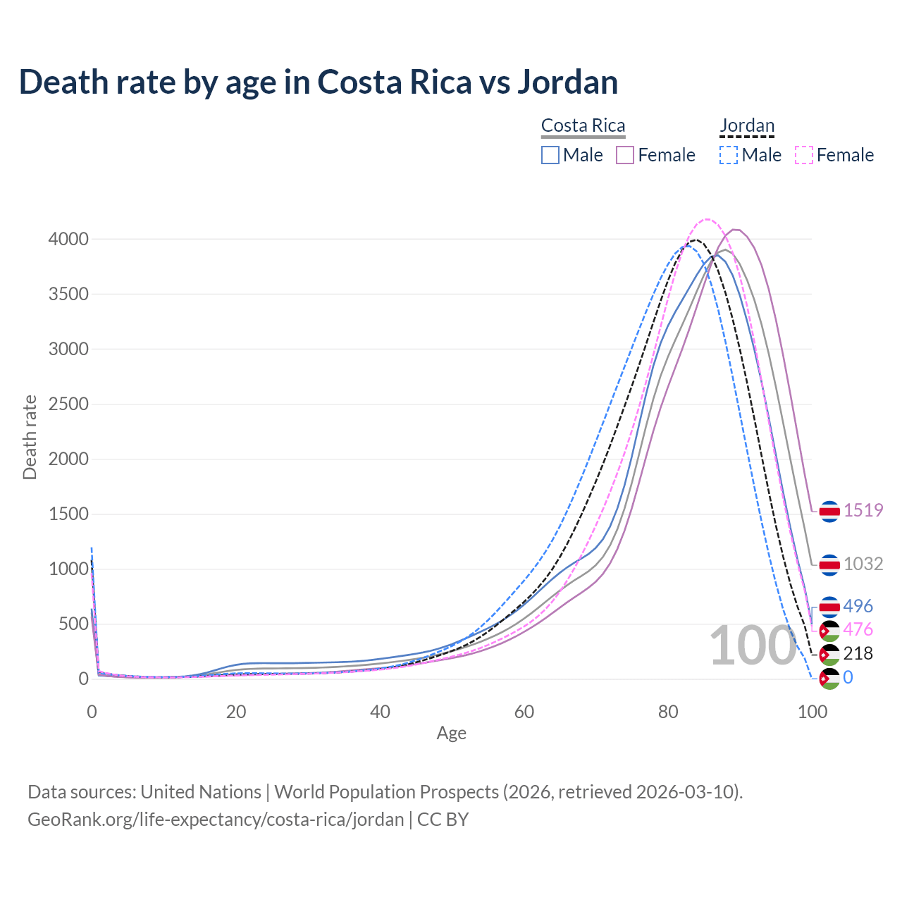In Costa Rica, the most common age of death is 88, compared to 84 in Jordan. The median age of death is 85 in Costa Rica and 81.3 in Jordan, meaning only half of each cohort is expected to live past that age.