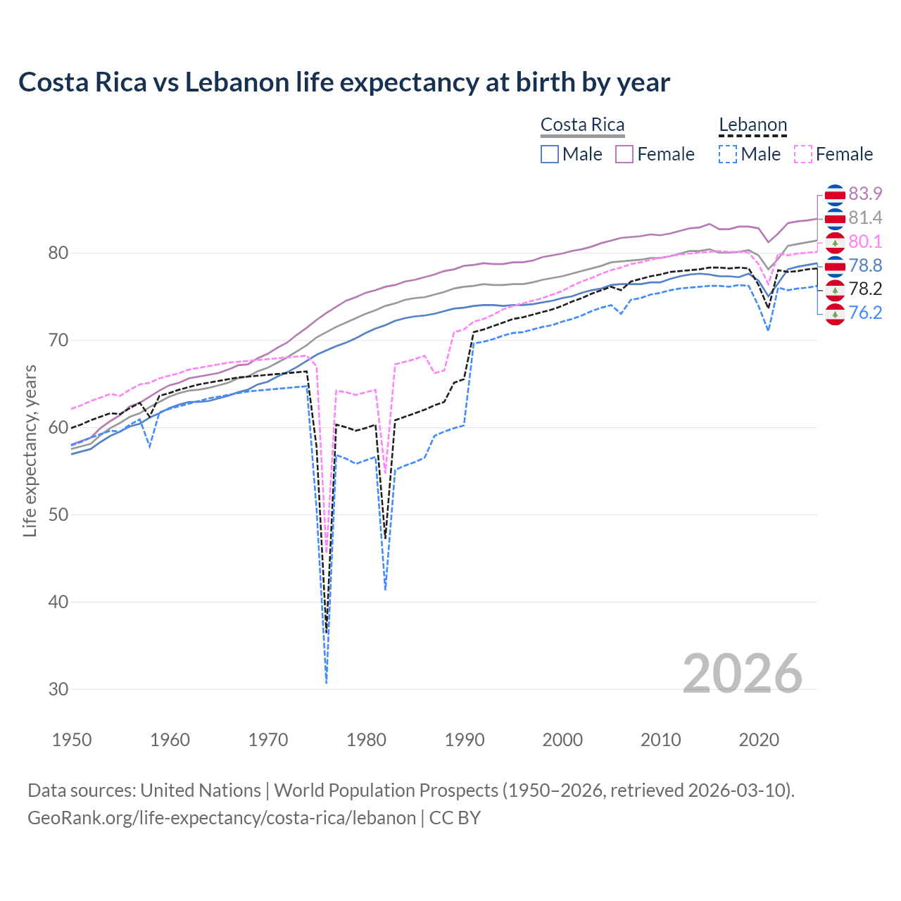 The average life expectancy at birth is 81.4 years in Costa Rica vs 78.2 in Lebanon. Costa Rica is ranked 39/197 by life expectancy, and Lebanon is 62/197. In Costa Rica, the life expectancy is 78.8 years for males and 83.9 years for females. In Lebanon, it's 76.2 years for males and 80.1 years for females.