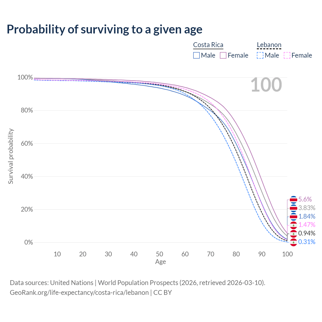This life expectancy calculator shows the odds of living to 100, 95, 90, and below based on current age for both males and females in Costa Rica and Lebanon, along with mean and median age of death. The calculations are based on the 2026 life tables (actuarial tables) from the UN World Population Prospects.