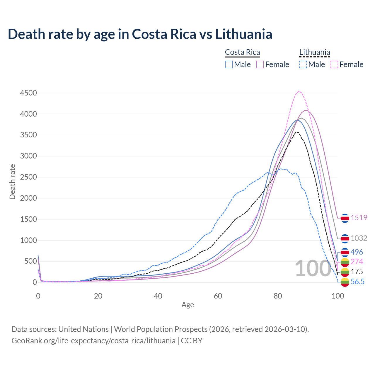 In Costa Rica, the most common age of death is 88, compared to 86 in Lithuania. The median age of death is 85 in Costa Rica and 80.4 in Lithuania, meaning only half of each cohort is expected to live past that age.