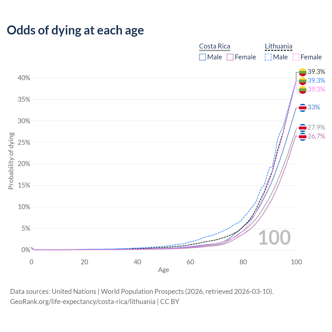 This life expectancy calculator shows the odds of living to 100, 95, 90, and below based on current age for both males and females in Costa Rica and Lithuania, along with mean and median age of death. The calculations are based on the 2026 life tables (actuarial tables) from the UN World Population Prospects.