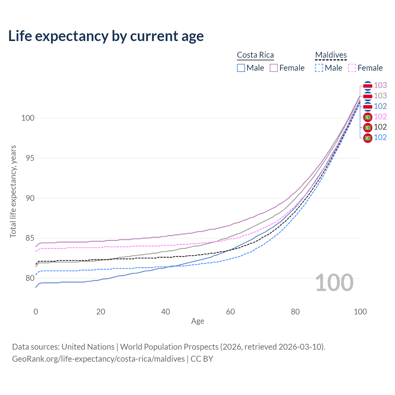 This life expectancy calculator shows the odds of living to 100, 95, 90, and below based on current age for both males and females in Costa Rica and Maldives, along with mean and median age of death. The calculations are based on the 2026 life tables (actuarial tables) from the UN World Population Prospects.