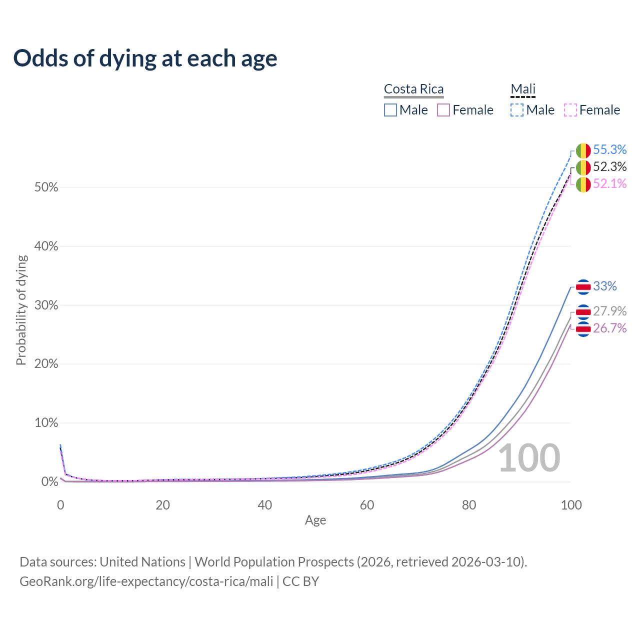 This life expectancy calculator shows the odds of living to 100, 95, 90, and below based on current age for both males and females in Costa Rica and Mali, along with mean and median age of death. The calculations are based on the 2026 life tables (actuarial tables) from the UN World Population Prospects.