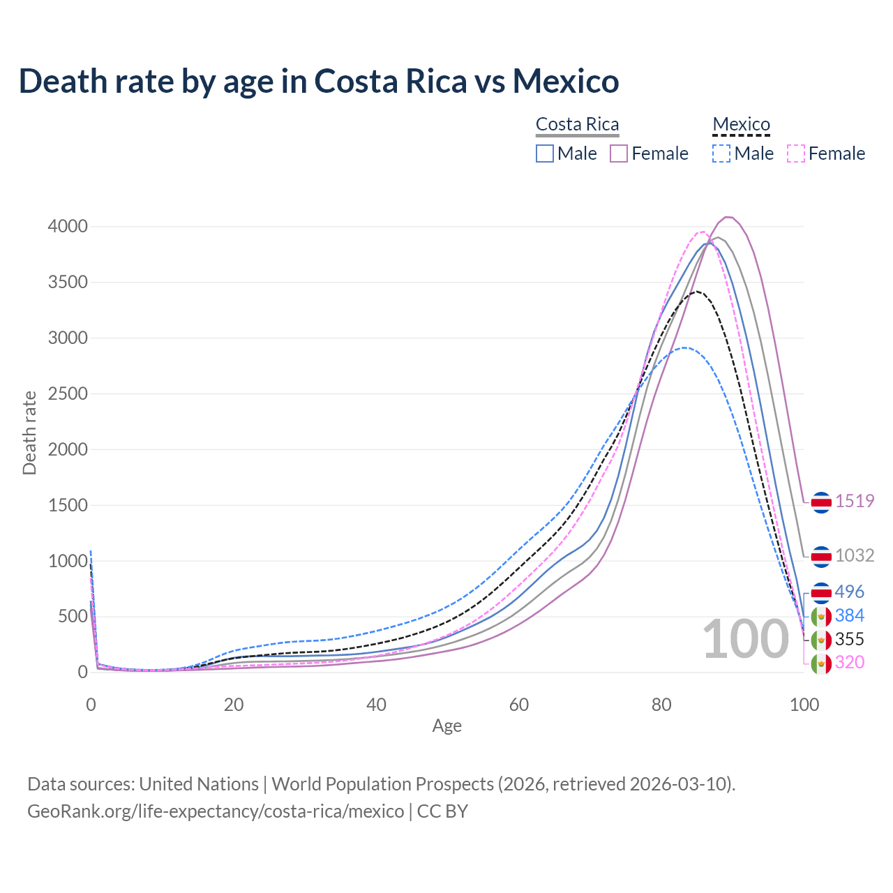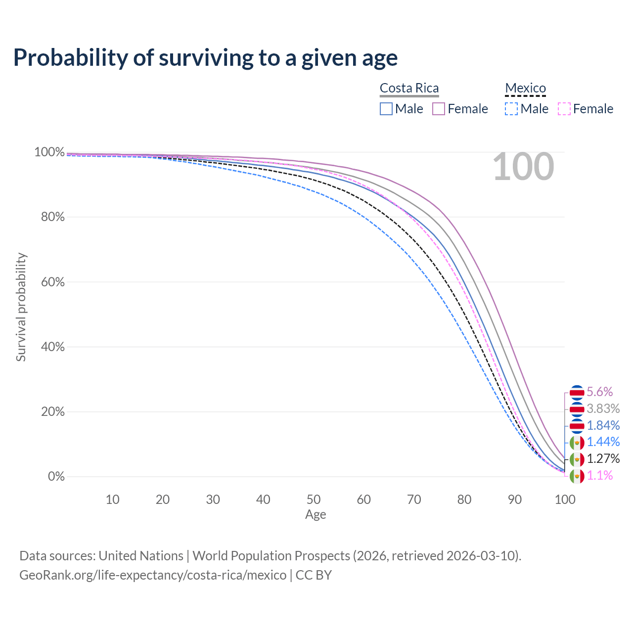 This life expectancy calculator shows the odds of living to 100, 95, 90, and below based on current age for both males and females in Costa Rica and Mexico, along with mean and median age of death. The calculations are based on the 2026 life tables (actuarial tables) from the UN World Population Prospects.