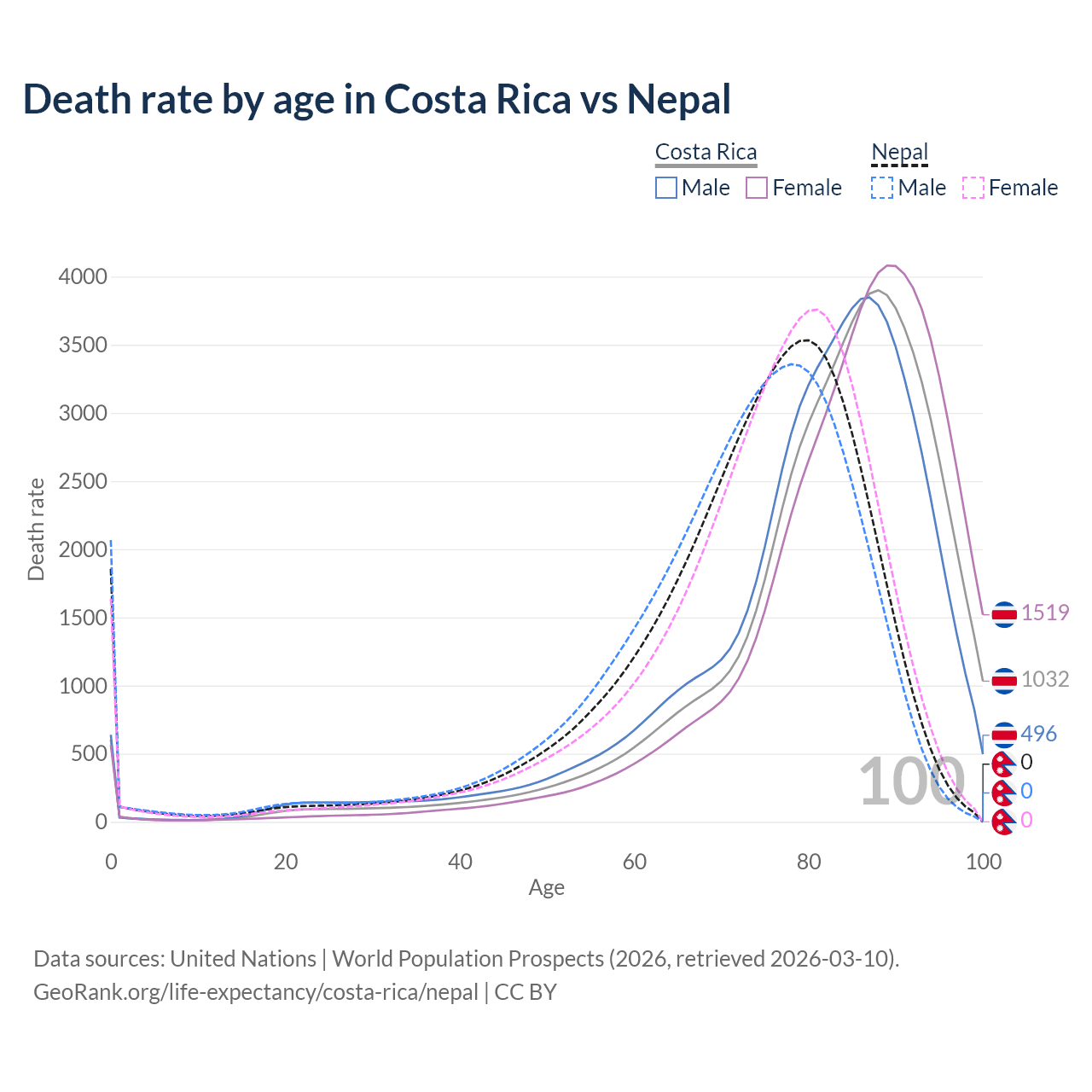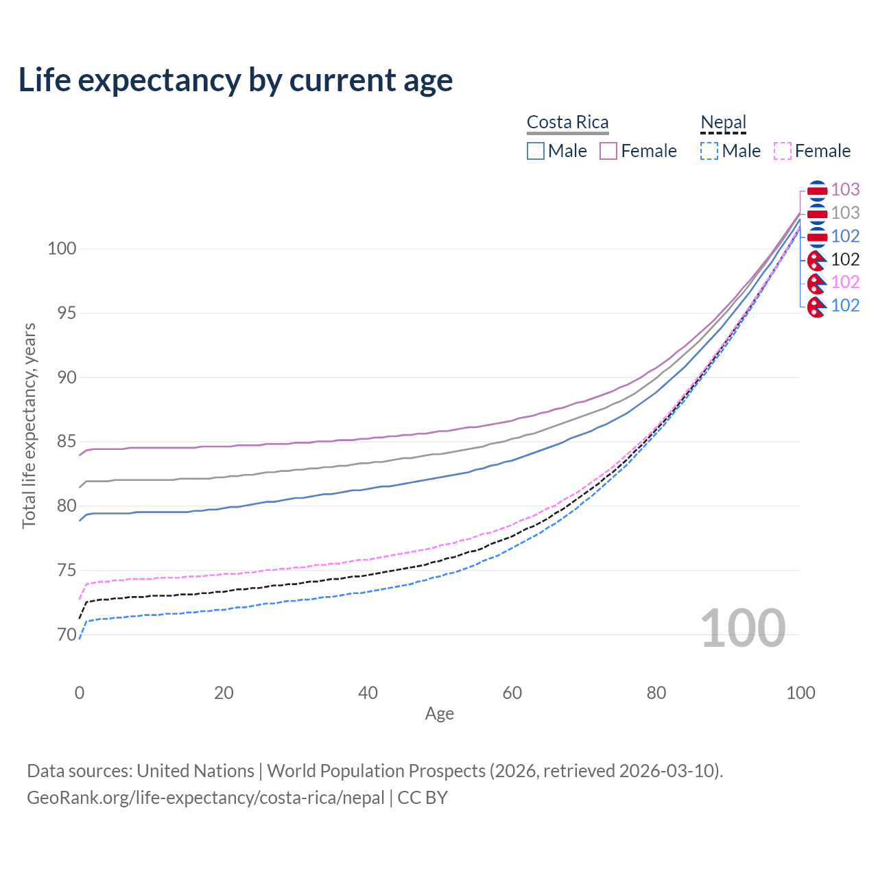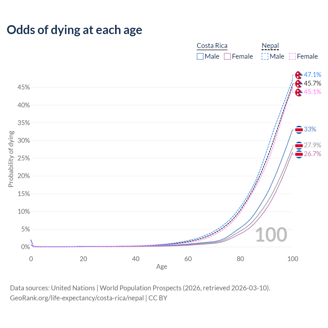 This life expectancy calculator shows the odds of living to 100, 95, 90, and below based on current age for both males and females in Costa Rica and Nepal, along with mean and median age of death. The calculations are based on the 2026 life tables (actuarial tables) from the UN World Population Prospects.