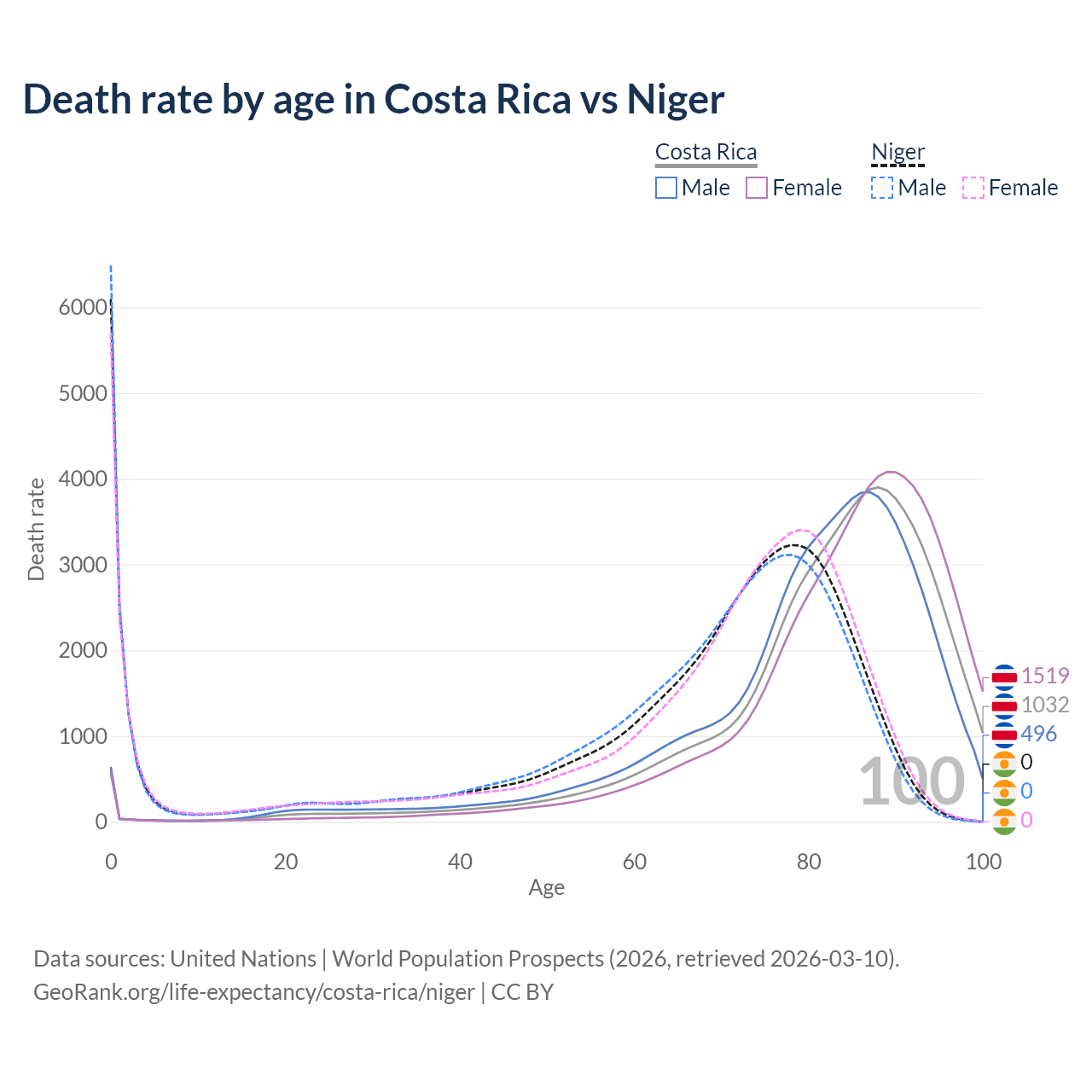 In Costa Rica, the most common age of death is 88, compared to 0 in Niger. The median age of death is 85 in Costa Rica and 71.7 in Niger, meaning only half of each cohort is expected to live past that age.