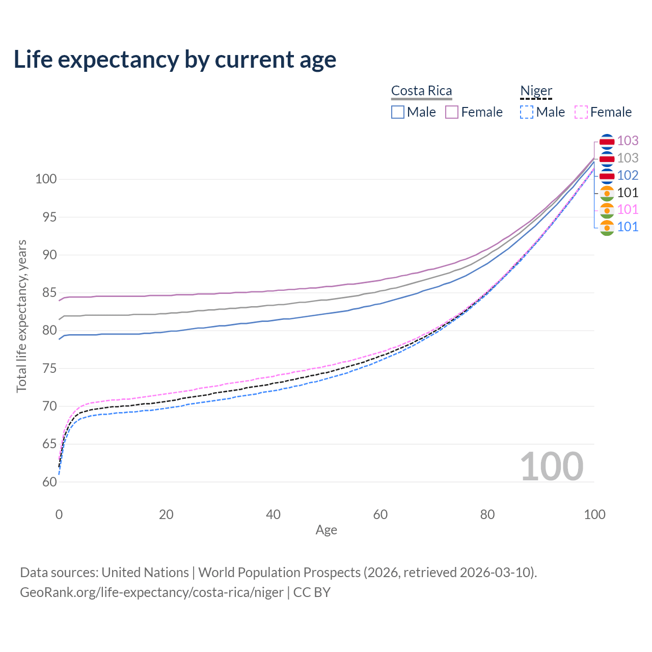 This life expectancy calculator shows the odds of living to 100, 95, 90, and below based on current age for both males and females in Costa Rica and Niger, along with mean and median age of death. The calculations are based on the 2026 life tables (actuarial tables) from the UN World Population Prospects.