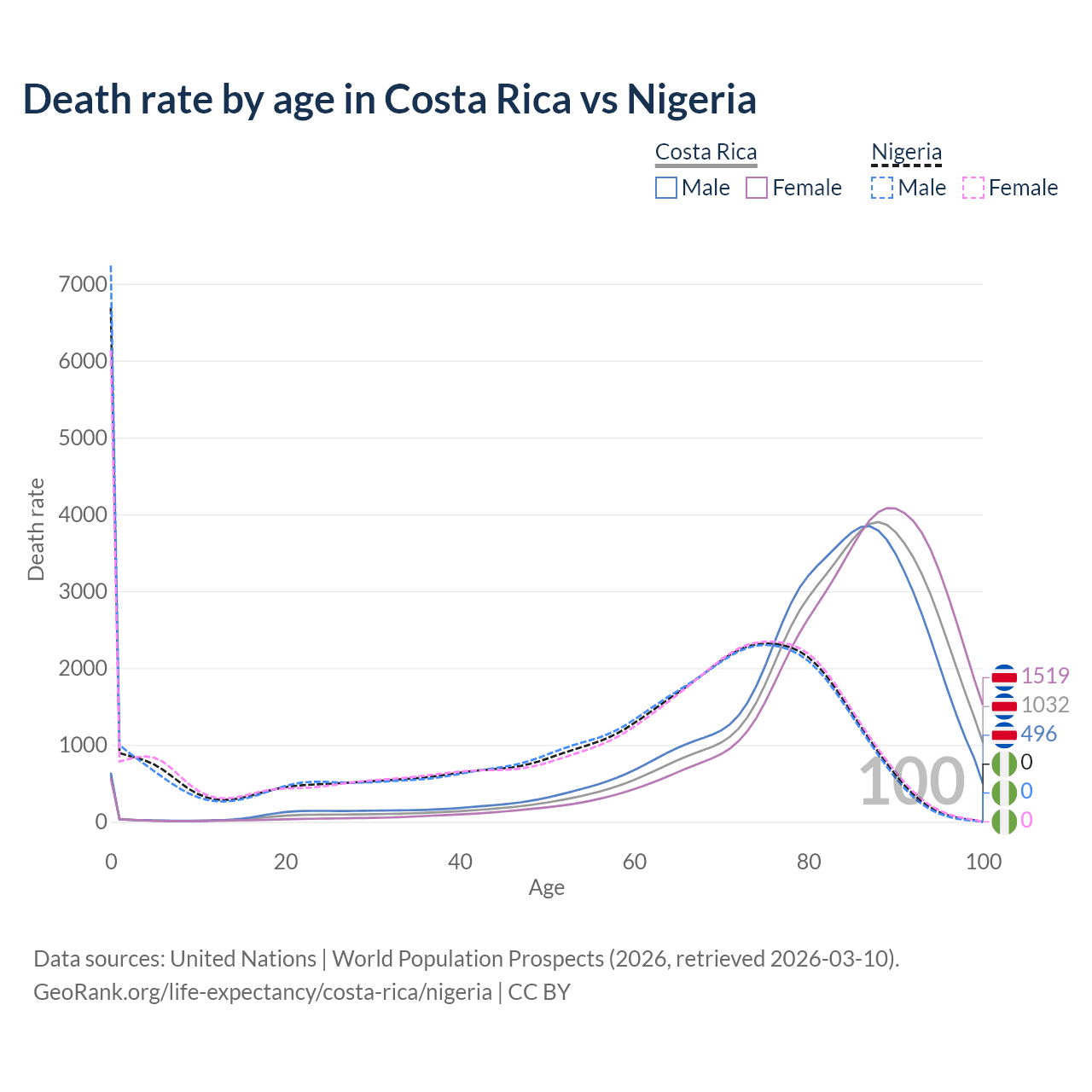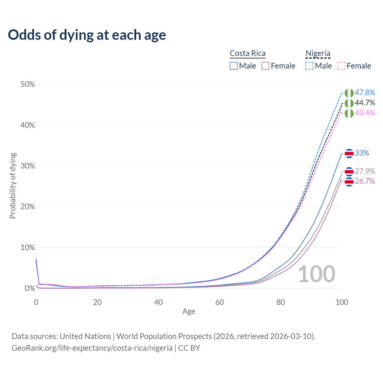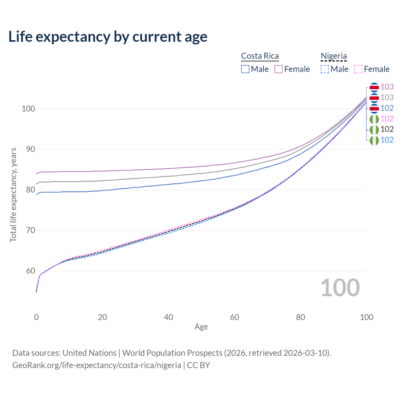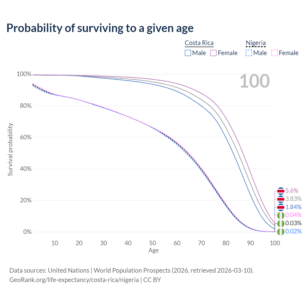 This life expectancy calculator shows the odds of living to 100, 95, 90, and below based on current age for both males and females in Costa Rica and Nigeria, along with mean and median age of death. The calculations are based on the 2026 life tables (actuarial tables) from the UN World Population Prospects.