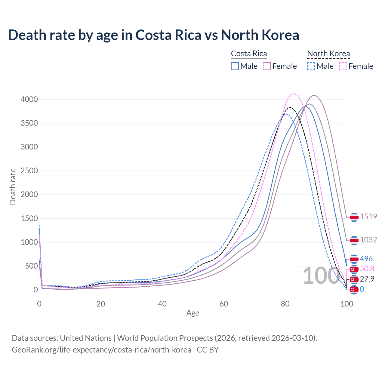 In Costa Rica, the most common age of death is 88, compared to 82 in North Korea. The median age of death is 85 in Costa Rica and 78.5 in North Korea, meaning only half of each cohort is expected to live past that age.