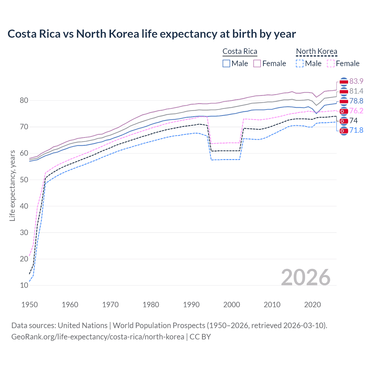 The average life expectancy at birth is 81.4 years in Costa Rica vs 74 in North Korea. Costa Rica is ranked 39/197 by life expectancy, and North Korea is 104/197. In Costa Rica, the life expectancy is 78.8 years for males and 83.9 years for females. In North Korea, it's 71.8 years for males and 76.2 years for females.