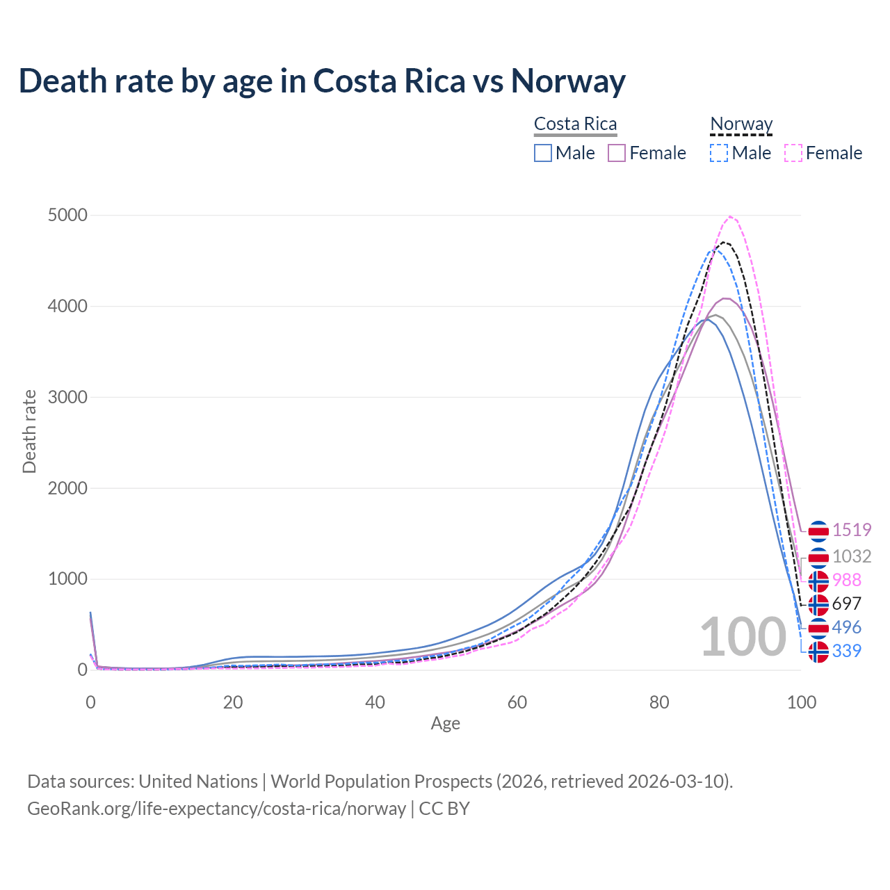 In Costa Rica, the most common age of death is 88, compared to 89 in Norway. The median age of death is 85 in Costa Rica and 86.5 in Norway, meaning only half of each cohort is expected to live past that age.
