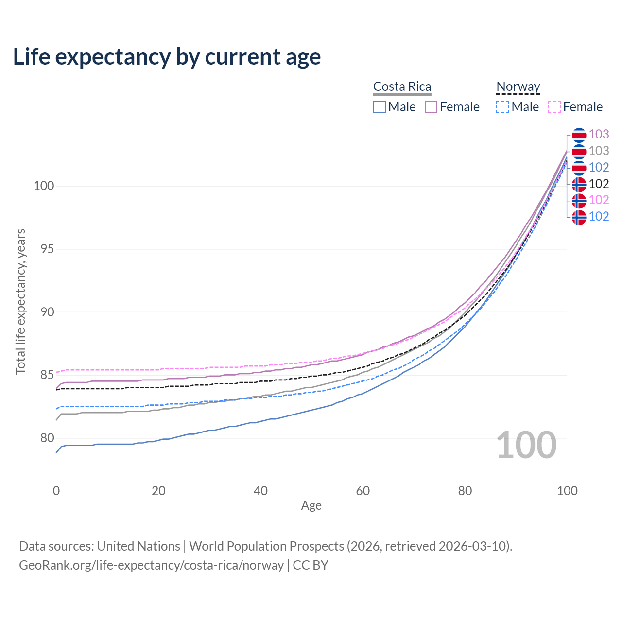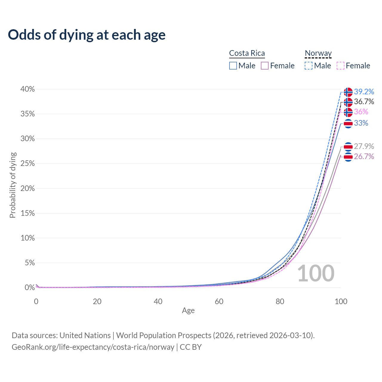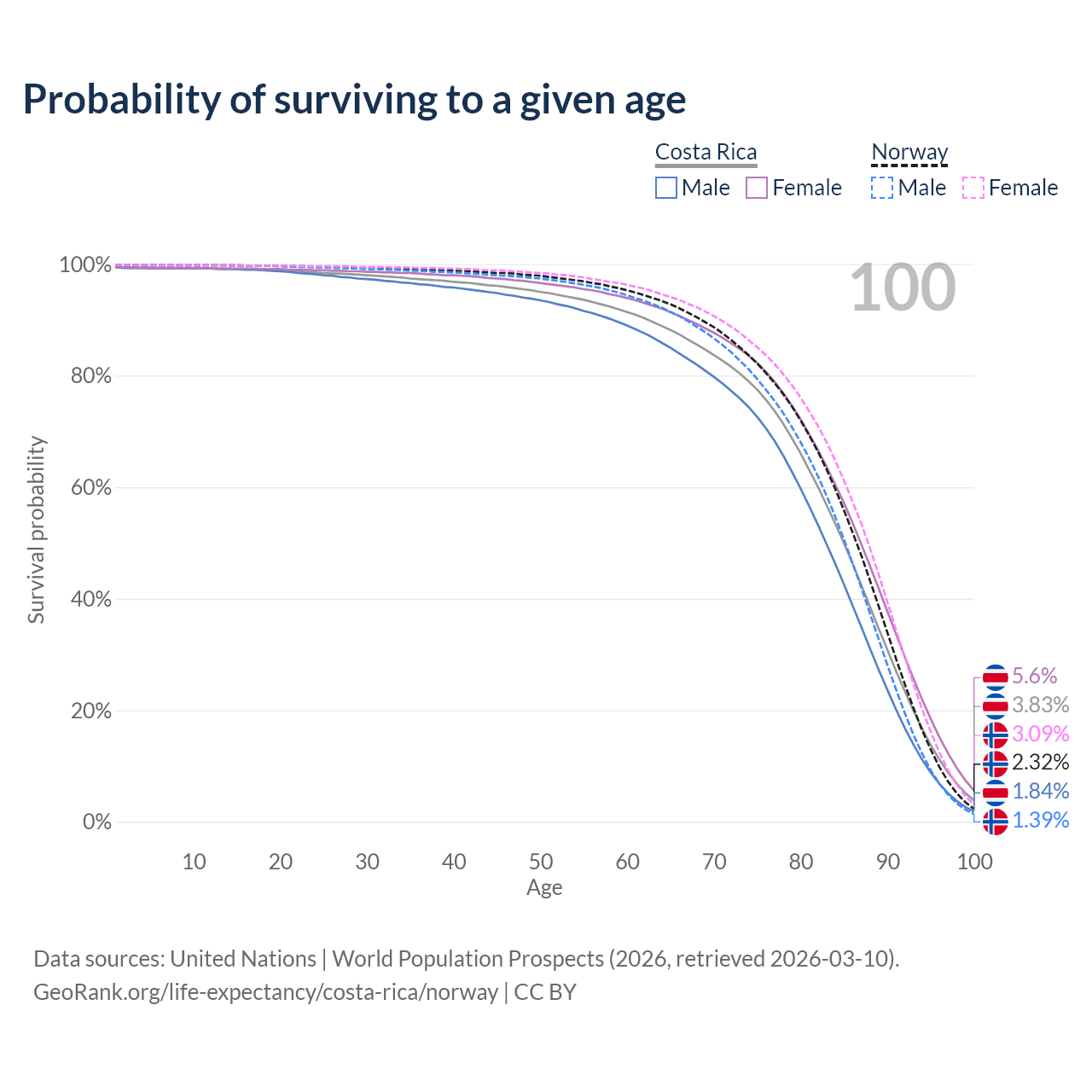 This life expectancy calculator shows the odds of living to 100, 95, 90, and below based on current age for both males and females in Costa Rica and Norway, along with mean and median age of death. The calculations are based on the 2026 life tables (actuarial tables) from the UN World Population Prospects.
