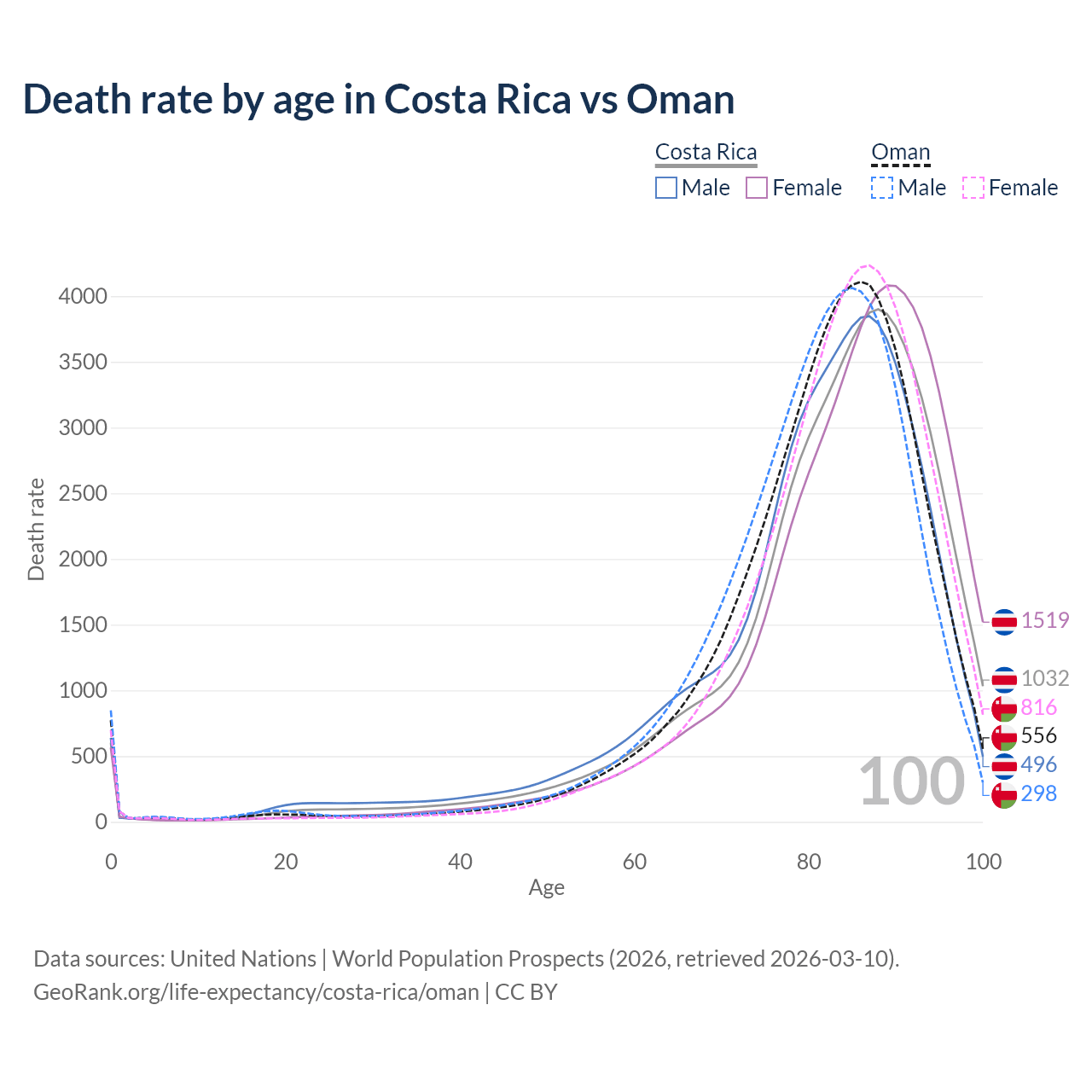 This life expectancy calculator shows the odds of living to 100, 95, 90, and below based on current age for both males and females in Costa Rica and Oman, along with mean and median age of death. The calculations are based on the 2026 life tables (actuarial tables) from the UN World Population Prospects.