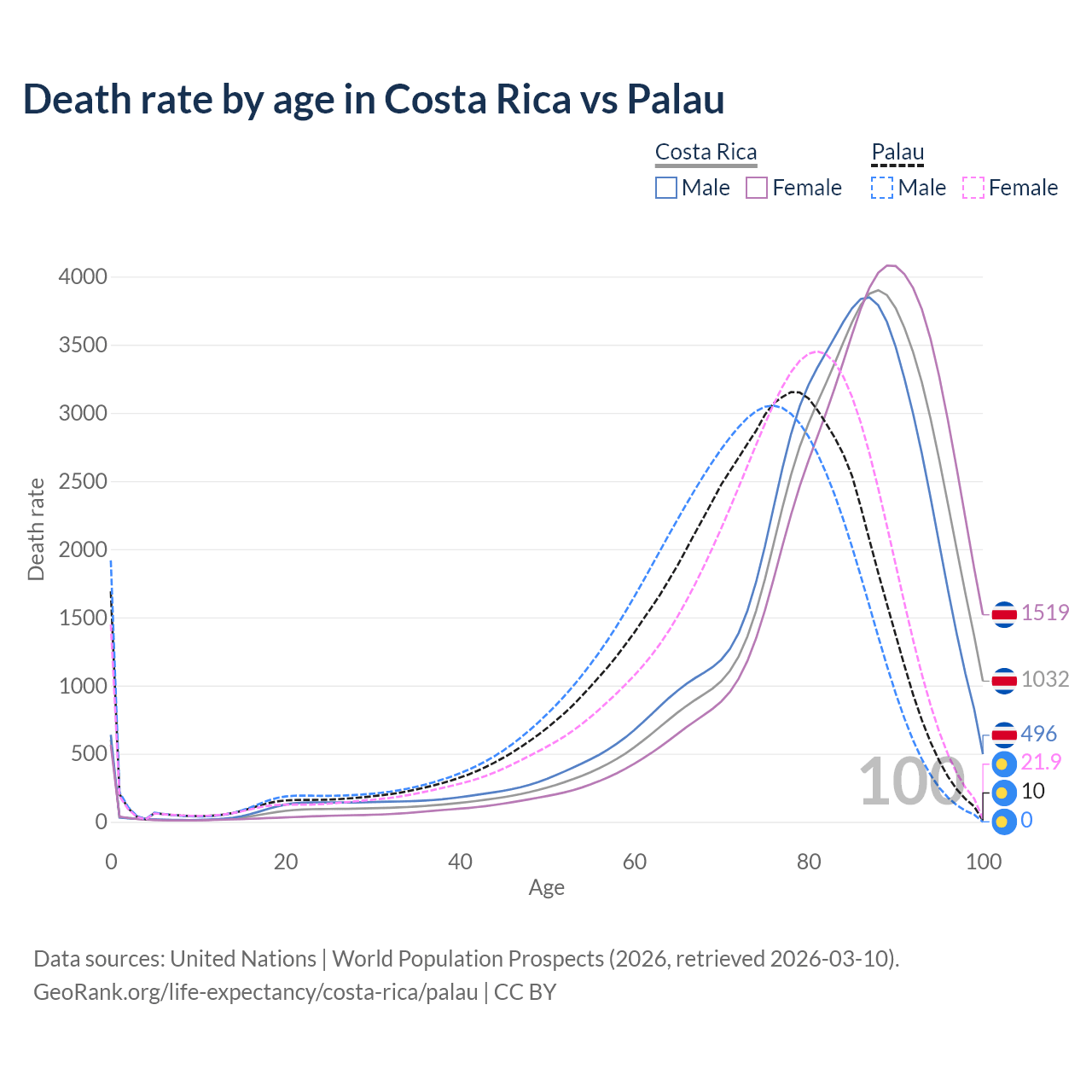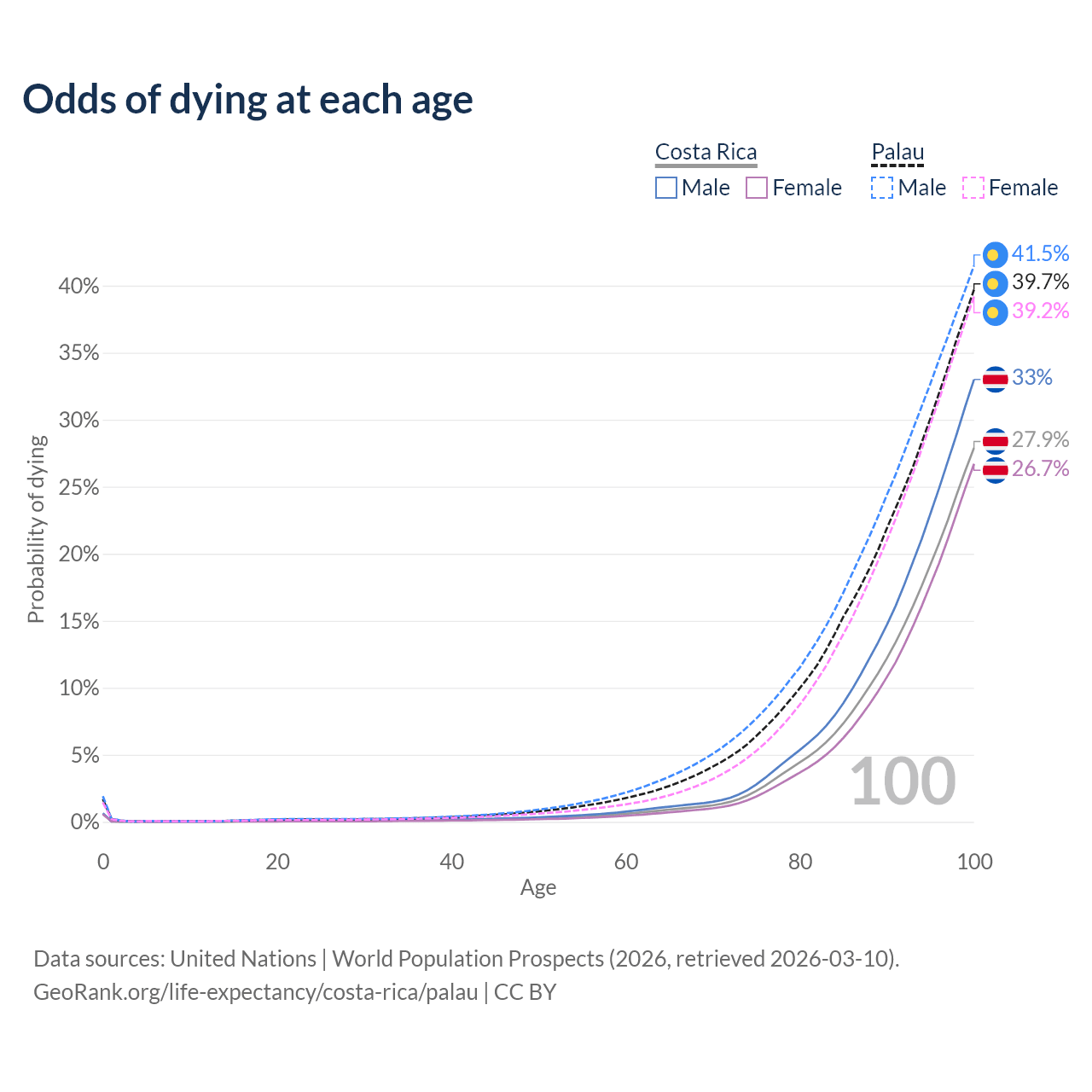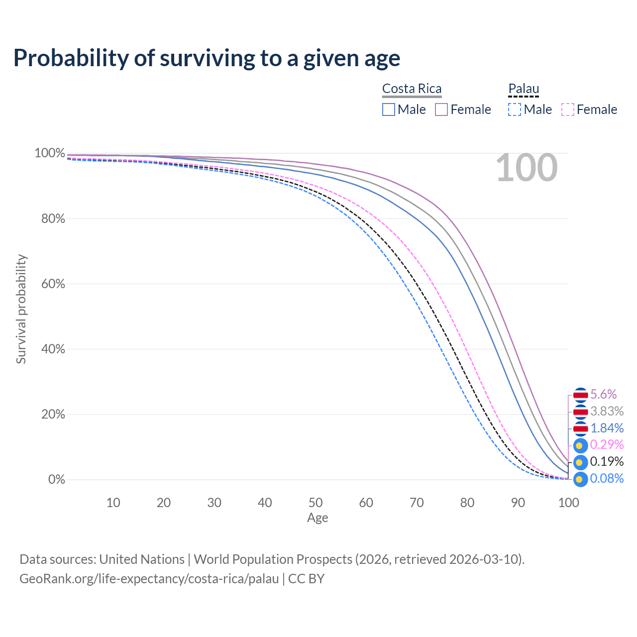 This life expectancy calculator shows the odds of living to 100, 95, 90, and below based on current age for both males and females in Costa Rica and Palau, along with mean and median age of death. The calculations are based on the 2026 life tables (actuarial tables) from the UN World Population Prospects.