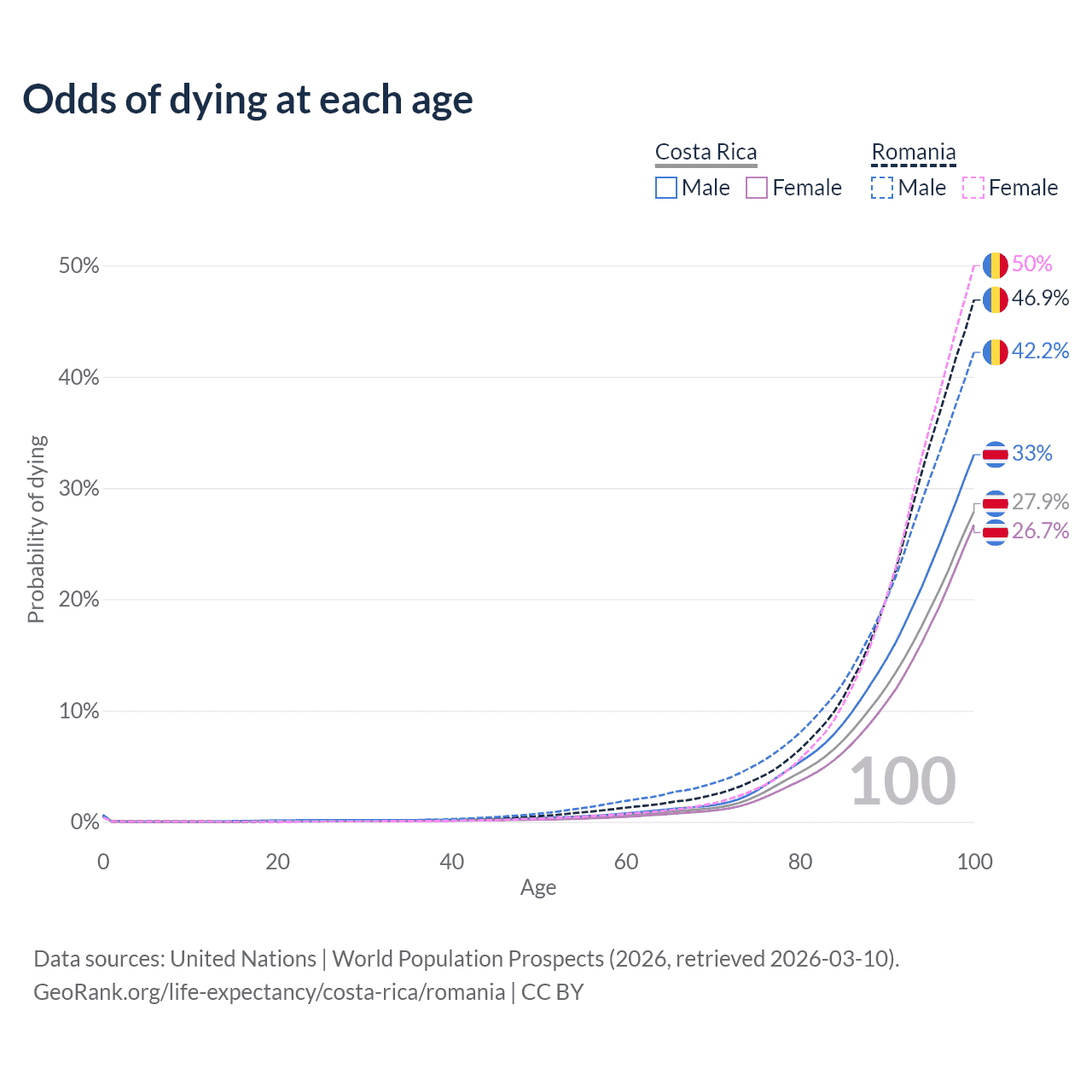 This life expectancy calculator shows the odds of living to 100, 95, 90, and below based on current age for both males and females in Costa Rica and Romania, along with mean and median age of death. The calculations are based on the 2026 life tables (actuarial tables) from the UN World Population Prospects.
