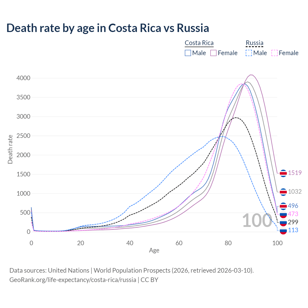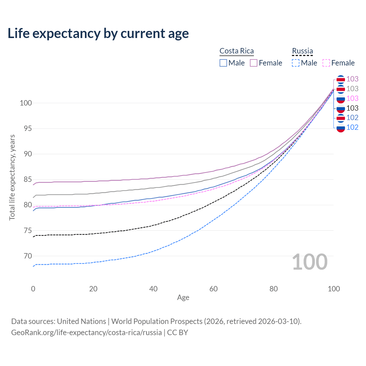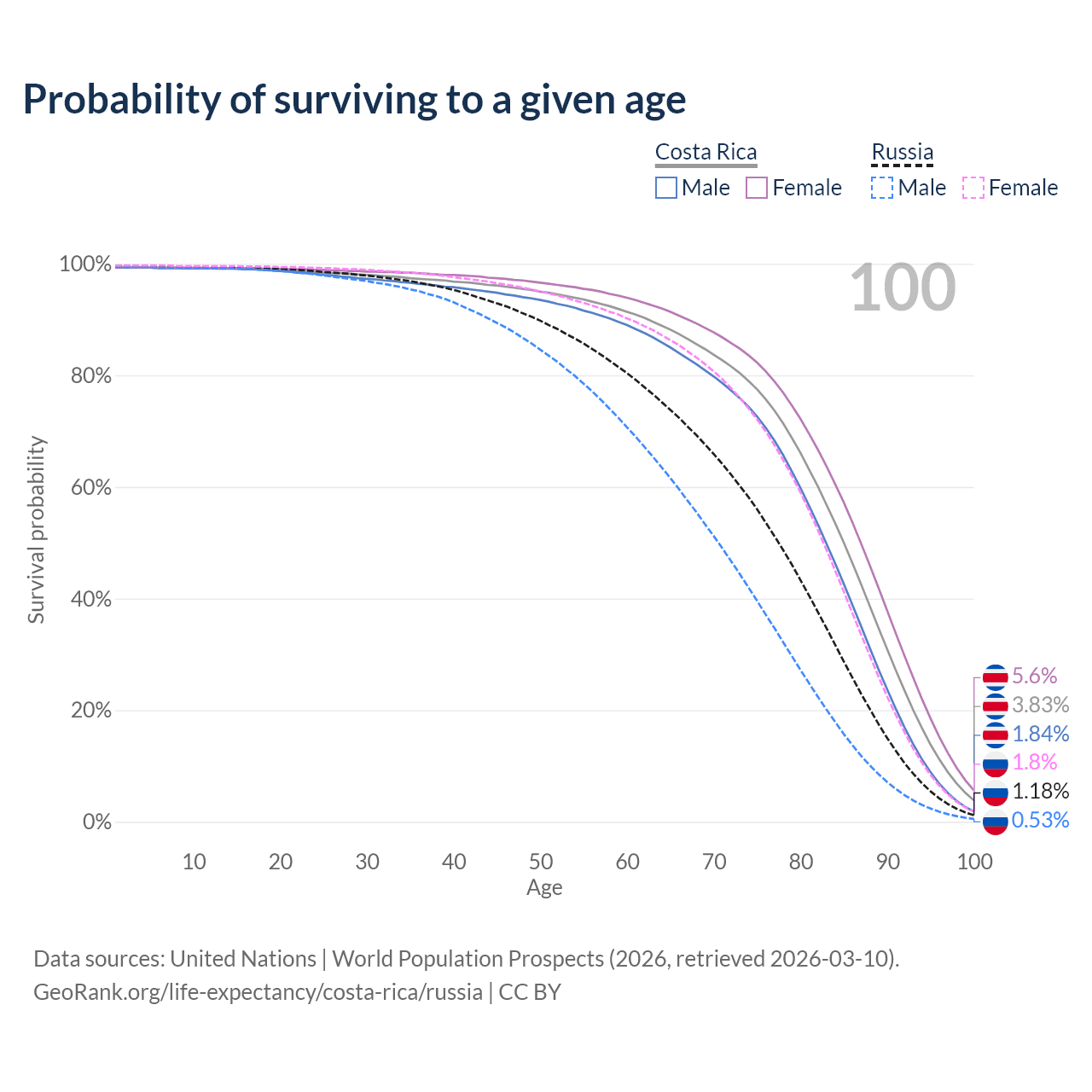 This life expectancy calculator shows the odds of living to 100, 95, 90, and below based on current age for both males and females in Costa Rica and Russia, along with mean and median age of death. The calculations are based on the 2026 life tables (actuarial tables) from the UN World Population Prospects.