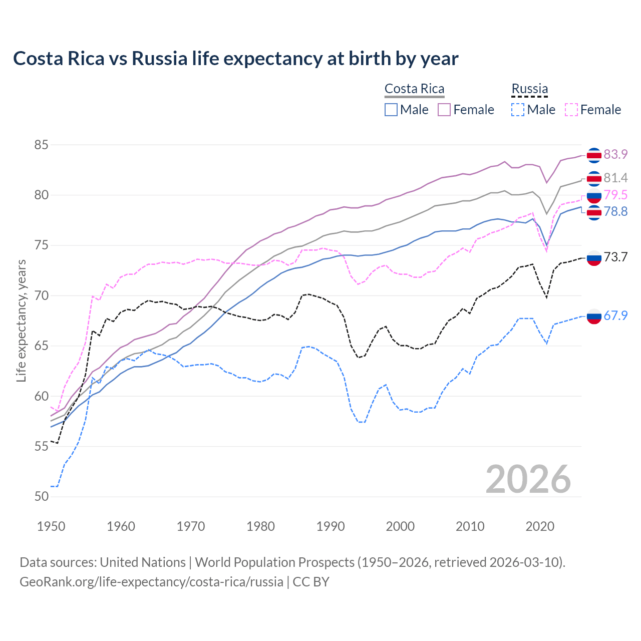 The average life expectancy at birth is 81.4 years in Costa Rica vs 73.7 in Russia. Costa Rica is ranked 39/197 by life expectancy, and Russia is 107/197. In Costa Rica, the life expectancy is 78.8 years for males and 83.9 years for females. In Russia, it's 67.9 years for males and 79.5 years for females.