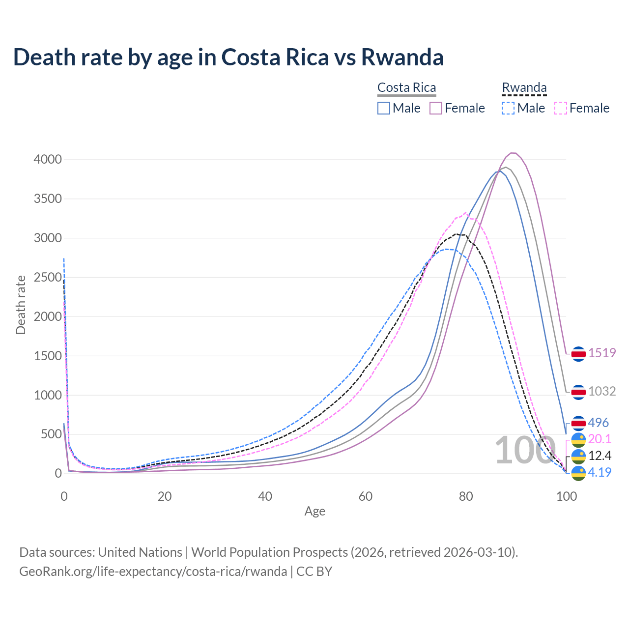 In Costa Rica, the most common age of death is 88, compared to 78 in Rwanda. The median age of death is 85 in Costa Rica and 73.5 in Rwanda, meaning only half of each cohort is expected to live past that age.