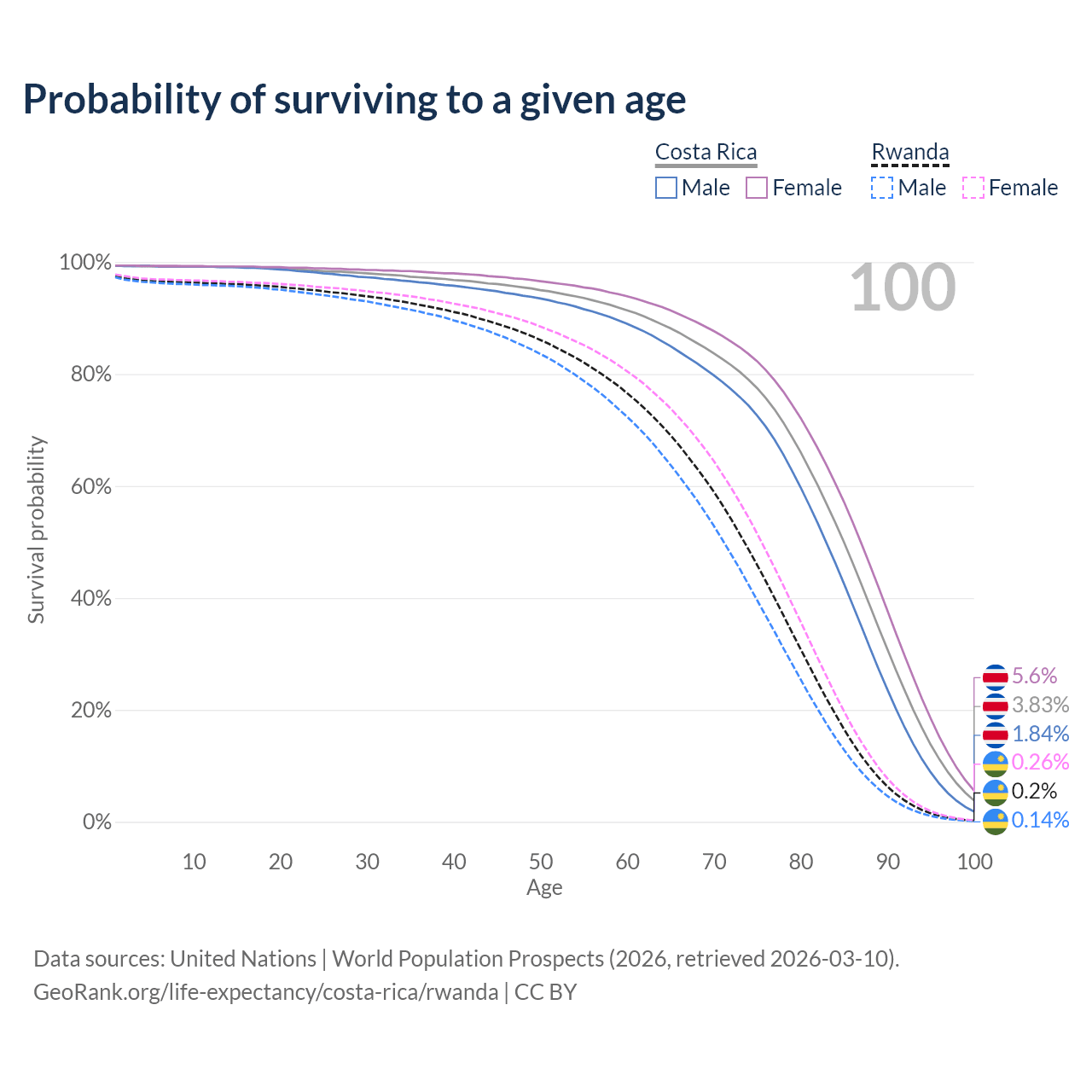 This life expectancy calculator shows the odds of living to 100, 95, 90, and below based on current age for both males and females in Costa Rica and Rwanda, along with mean and median age of death. The calculations are based on the 2026 life tables (actuarial tables) from the UN World Population Prospects.