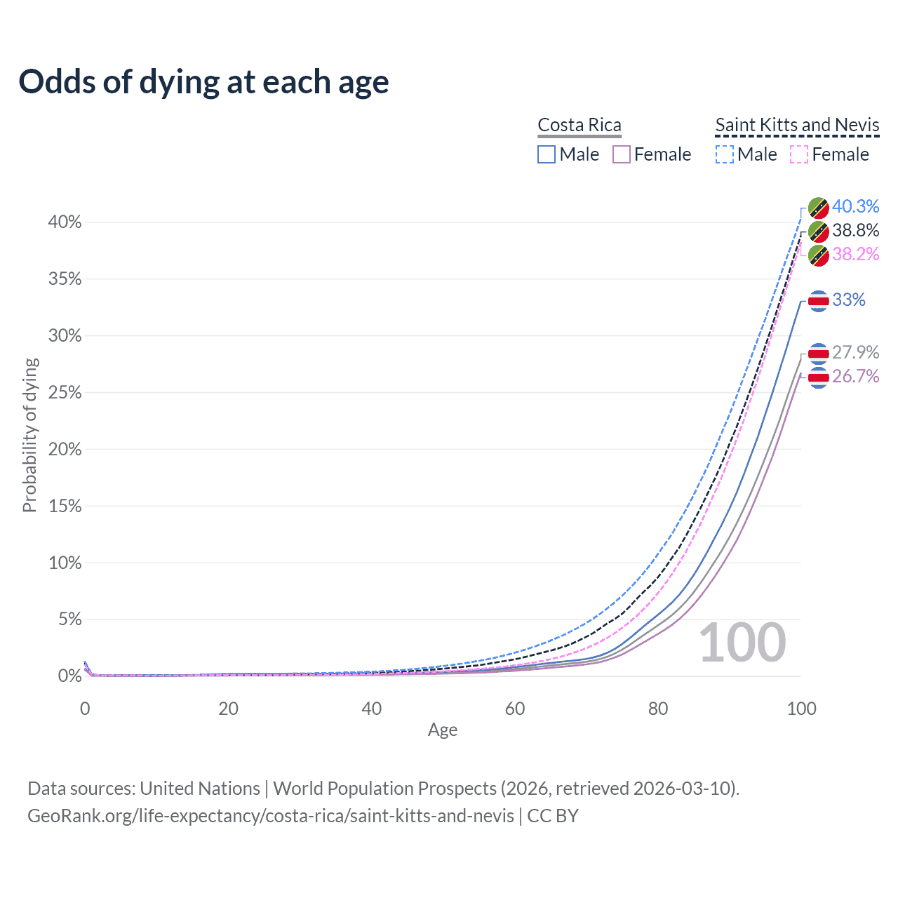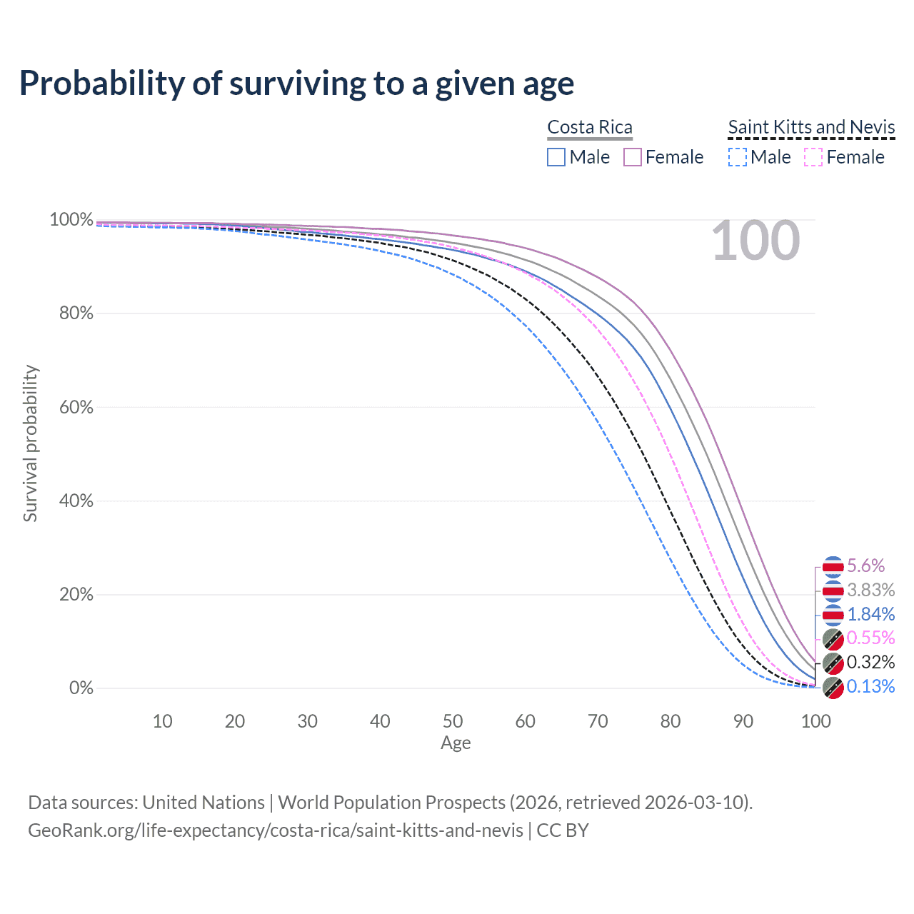 This life expectancy calculator shows the odds of living to 100, 95, 90, and below based on current age for both males and females in Costa Rica and Saint Kitts and Nevis, along with mean and median age of death. The calculations are based on the 2026 life tables (actuarial tables) from the UN World Population Prospects.