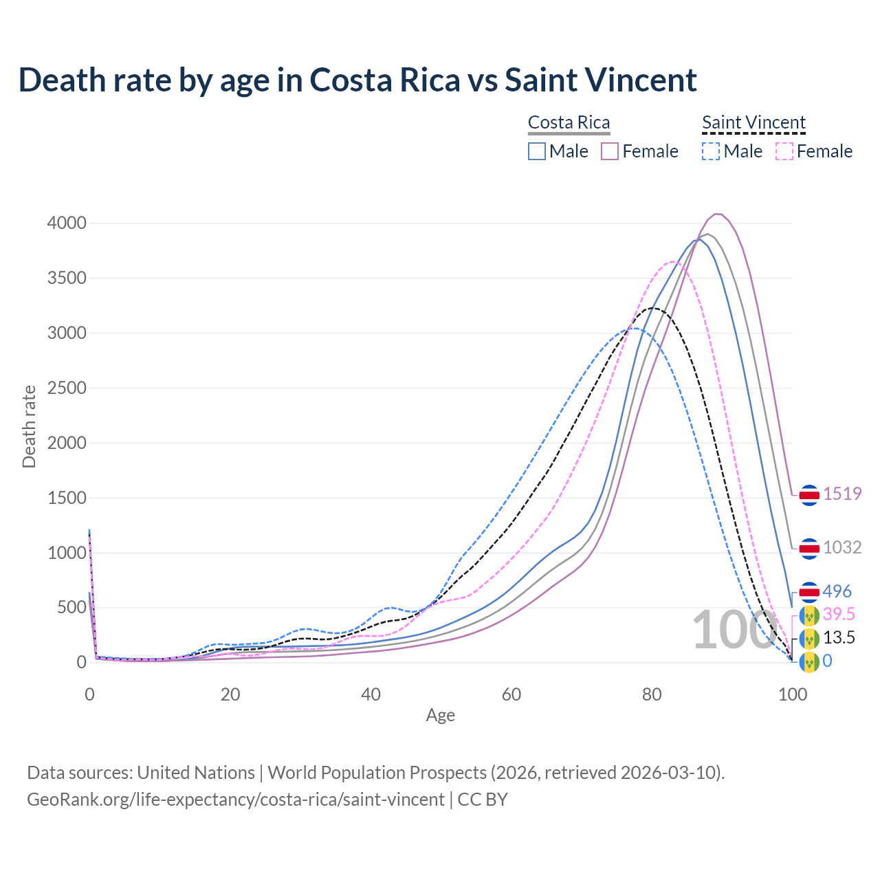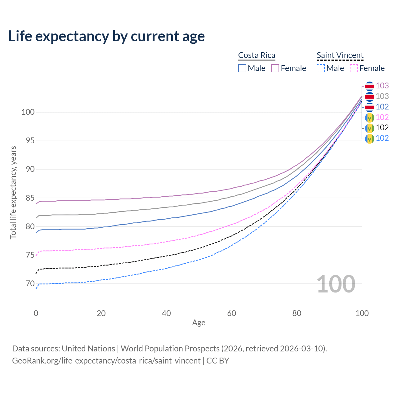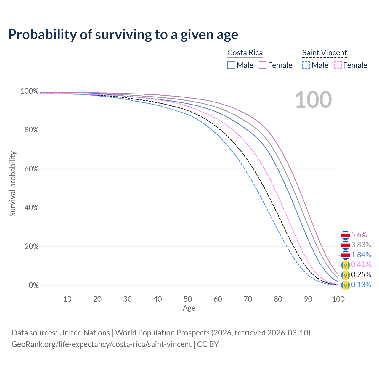 This life expectancy calculator shows the odds of living to 100, 95, 90, and below based on current age for both males and females in Costa Rica and Saint Vincent, along with mean and median age of death. The calculations are based on the 2026 life tables (actuarial tables) from the UN World Population Prospects.