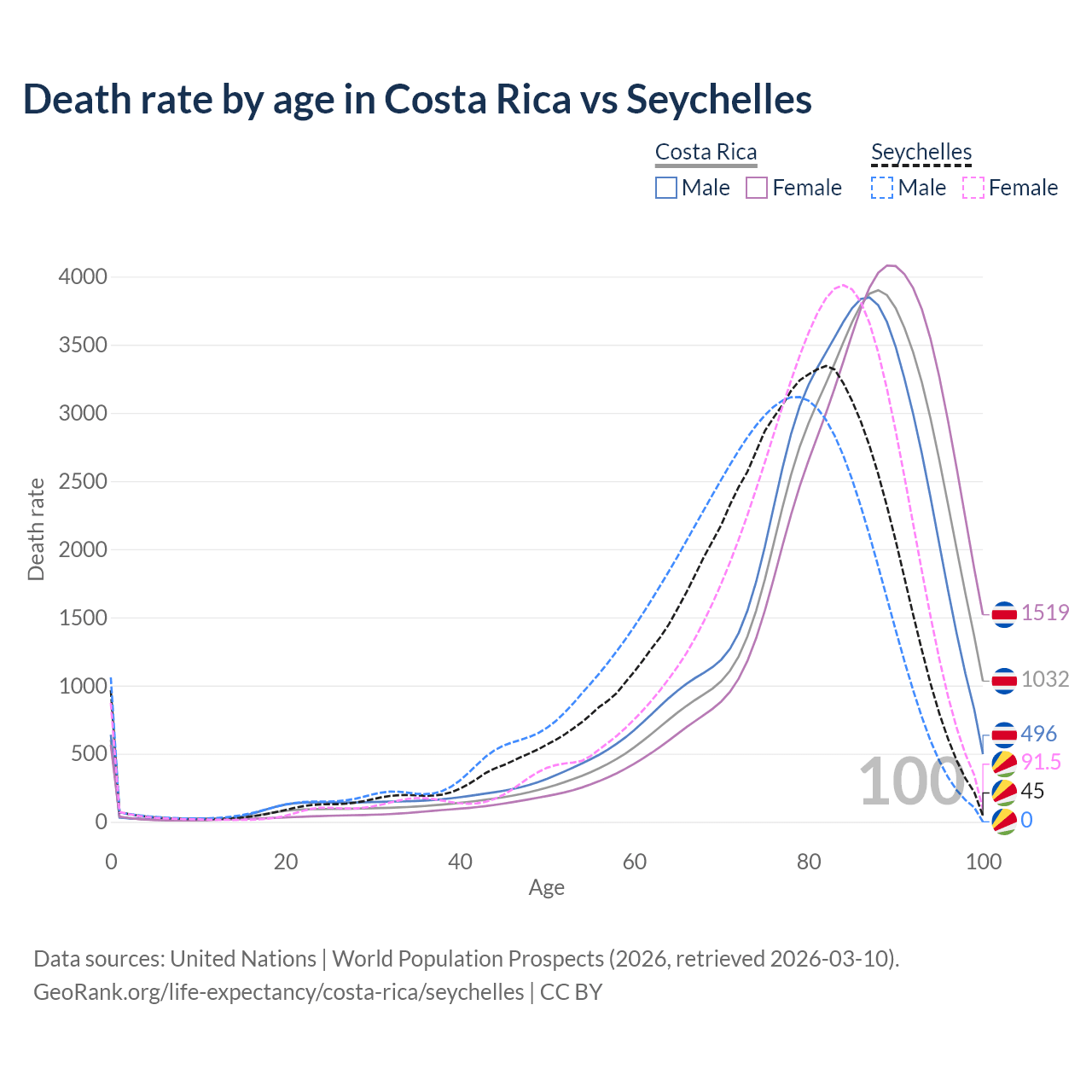 In Costa Rica, the most common age of death is 88, compared to 82 in the Seychelles. The median age of death is 85 in Costa Rica and 77 in the Seychelles, meaning only half of each cohort is expected to live past that age.