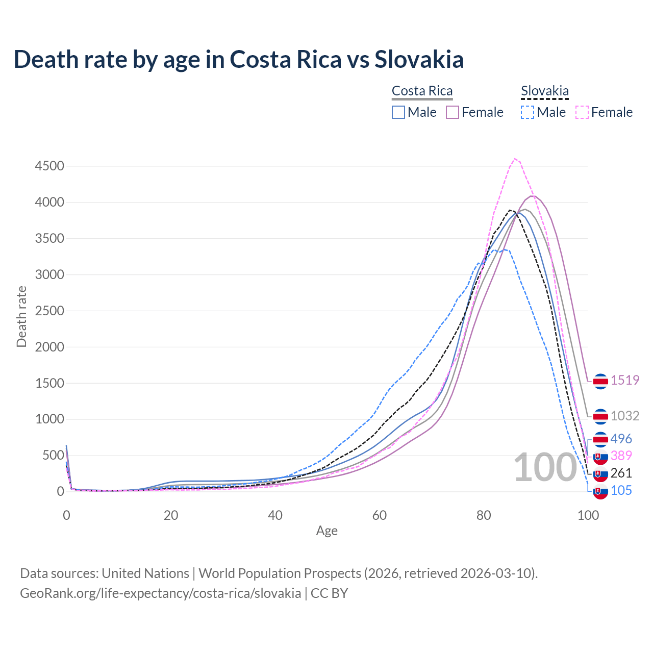 In Costa Rica, the most common age of death is 88, compared to 85 in Slovakia. The median age of death is 85 in Costa Rica and 82 in Slovakia, meaning only half of each cohort is expected to live past that age.