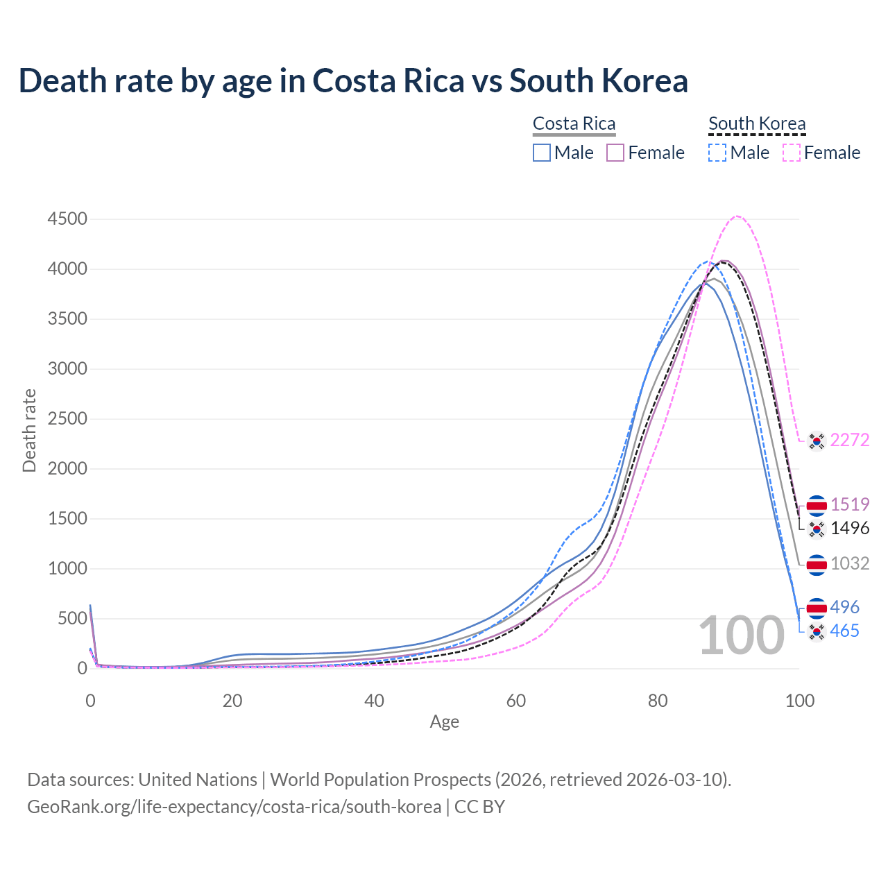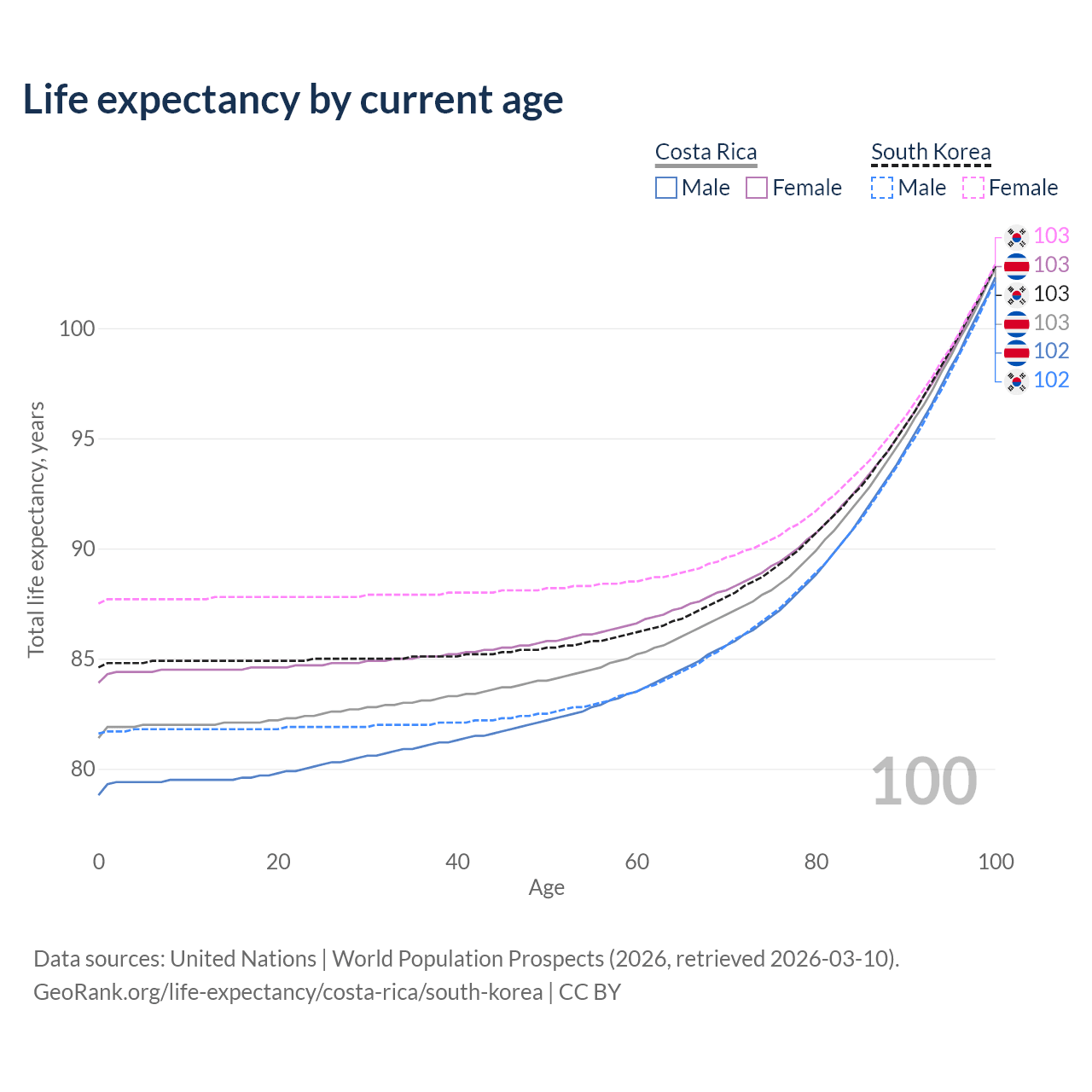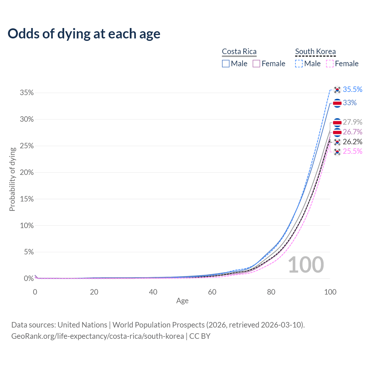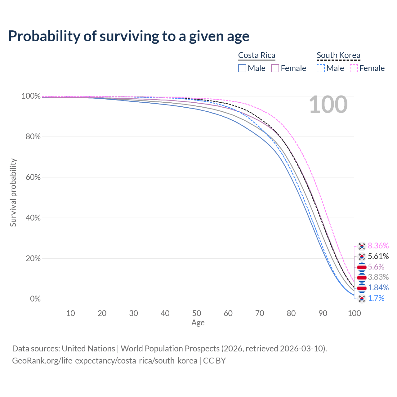 This life expectancy calculator shows the odds of living to 100, 95, 90, and below based on current age for both males and females in Costa Rica and South Korea, along with mean and median age of death. The calculations are based on the 2026 life tables (actuarial tables) from the UN World Population Prospects.