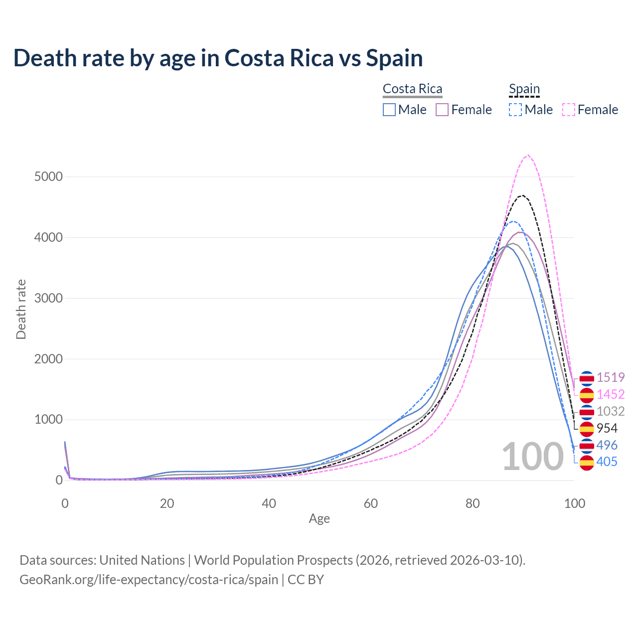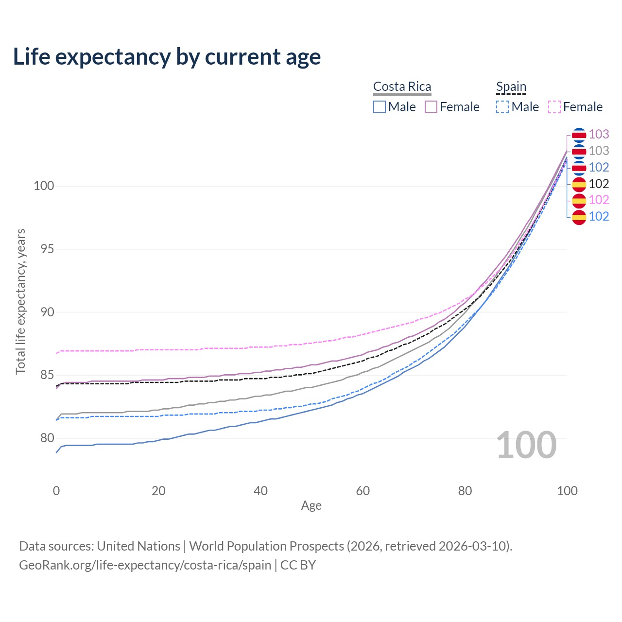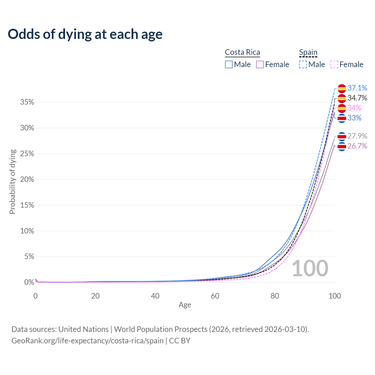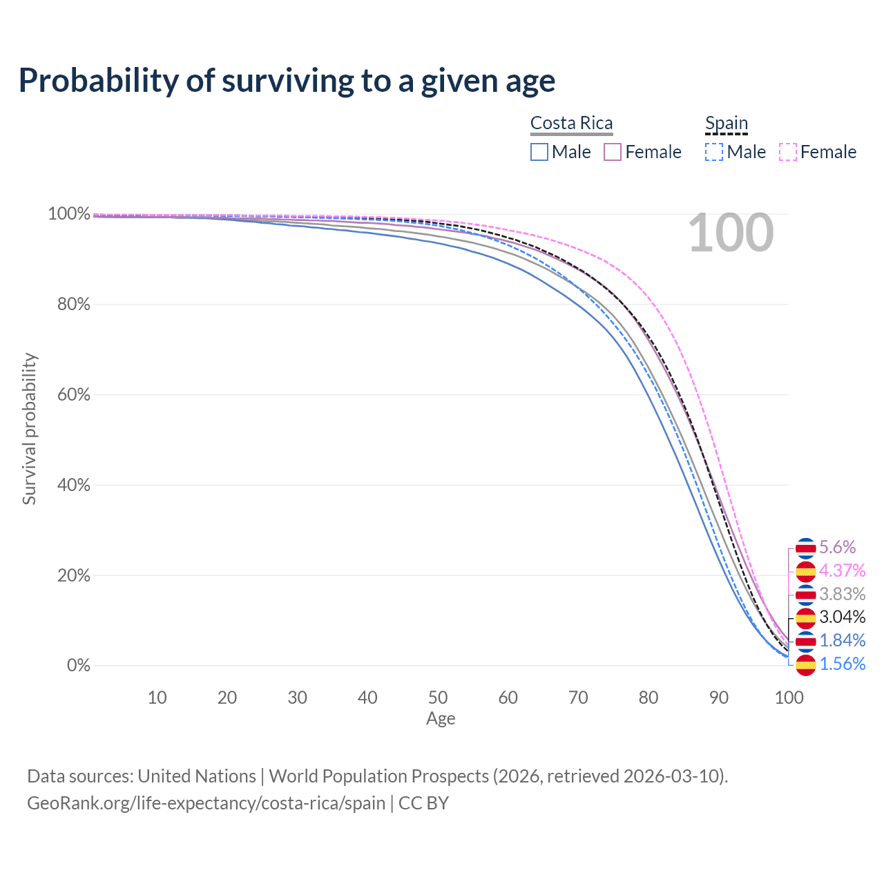 This life expectancy calculator shows the odds of living to 100, 95, 90, and below based on current age for both males and females in Costa Rica and Spain, along with mean and median age of death. The calculations are based on the 2026 life tables (actuarial tables) from the UN World Population Prospects.