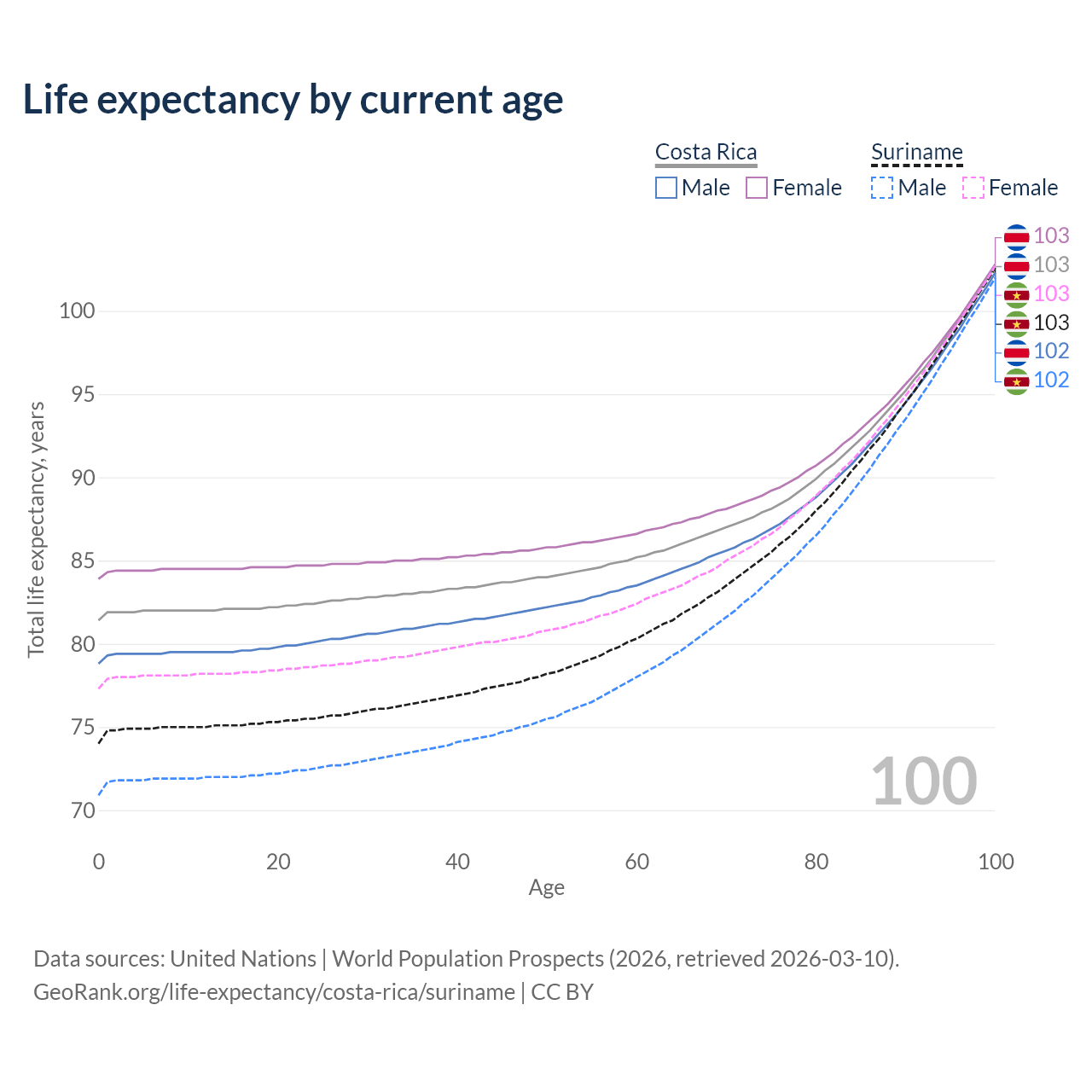 This life expectancy calculator shows the odds of living to 100, 95, 90, and below based on current age for both males and females in Costa Rica and Suriname, along with mean and median age of death. The calculations are based on the 2026 life tables (actuarial tables) from the UN World Population Prospects.