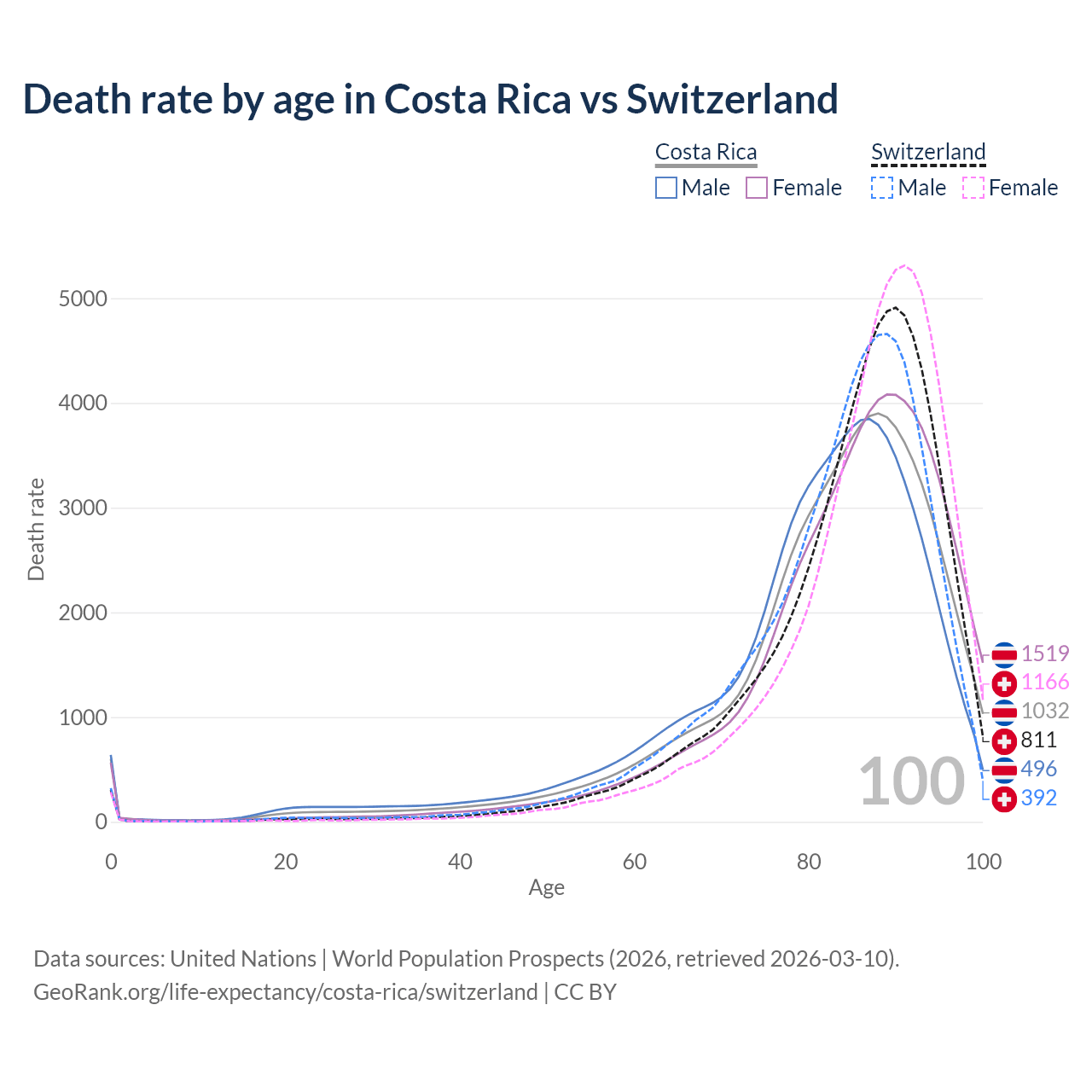 In Costa Rica, the most common age of death is 88, compared to 90 in Switzerland. The median age of death is 85 in Costa Rica and 87.2 in Switzerland, meaning only half of each cohort is expected to live past that age.