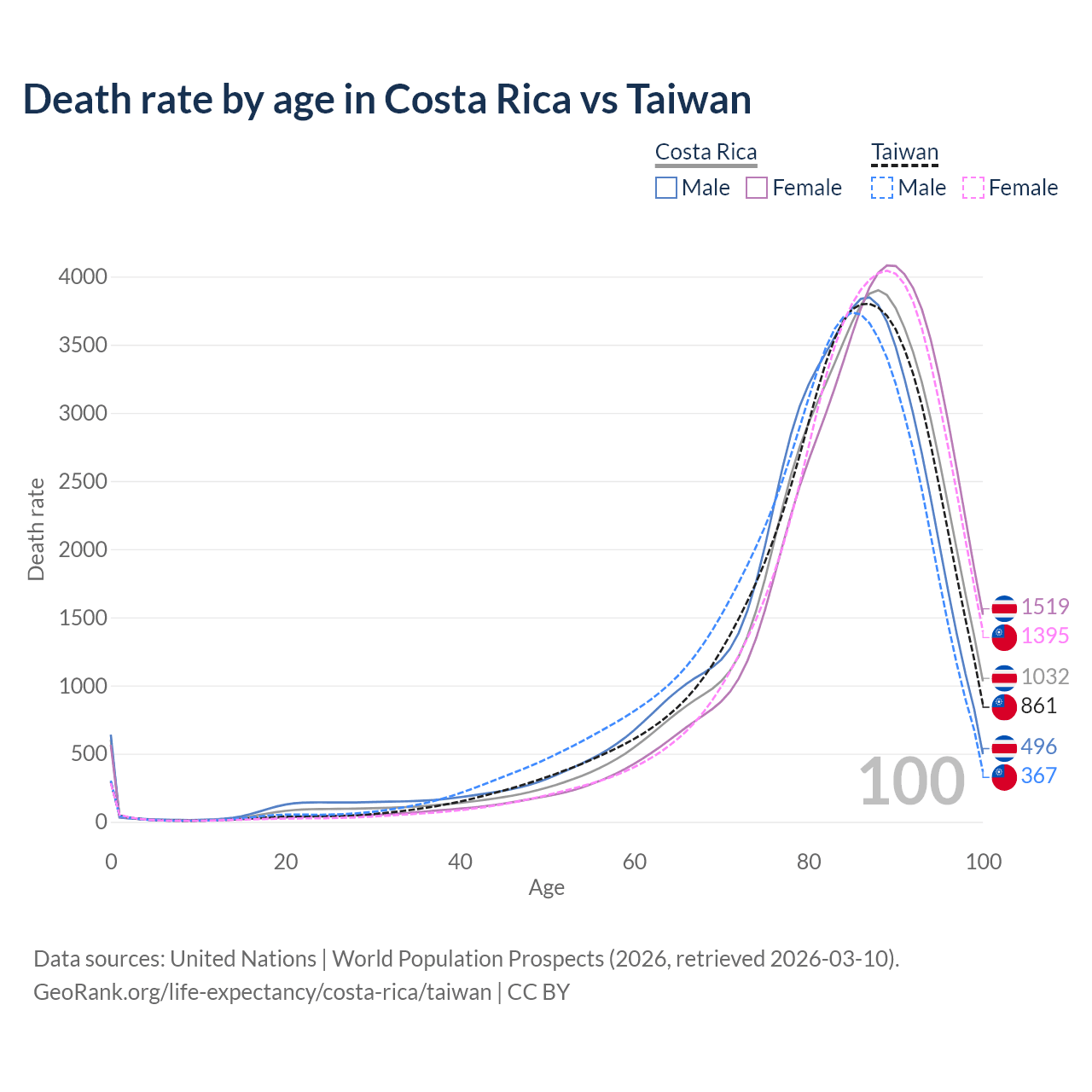 This life expectancy calculator shows the odds of living to 100, 95, 90, and below based on current age for both males and females in Costa Rica and Taiwan, along with mean and median age of death. The calculations are based on the 2026 life tables (actuarial tables) from the UN World Population Prospects.