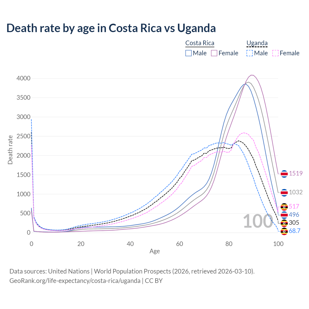 In Costa Rica, the most common age of death is 88, compared to 0 in Uganda. The median age of death is 85 in Costa Rica and 73.3 in Uganda, meaning only half of each cohort is expected to live past that age.