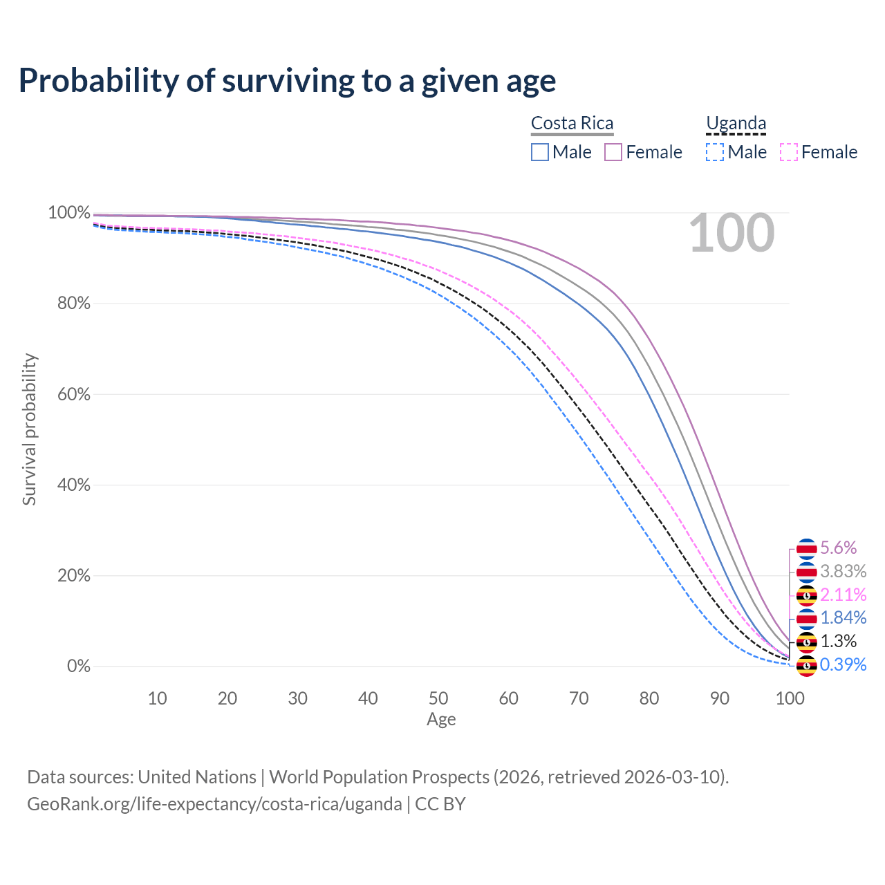 This life expectancy calculator shows the odds of living to 100, 95, 90, and below based on current age for both males and females in Costa Rica and Uganda, along with mean and median age of death. The calculations are based on the 2026 life tables (actuarial tables) from the UN World Population Prospects.