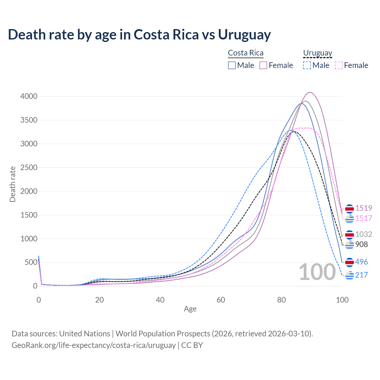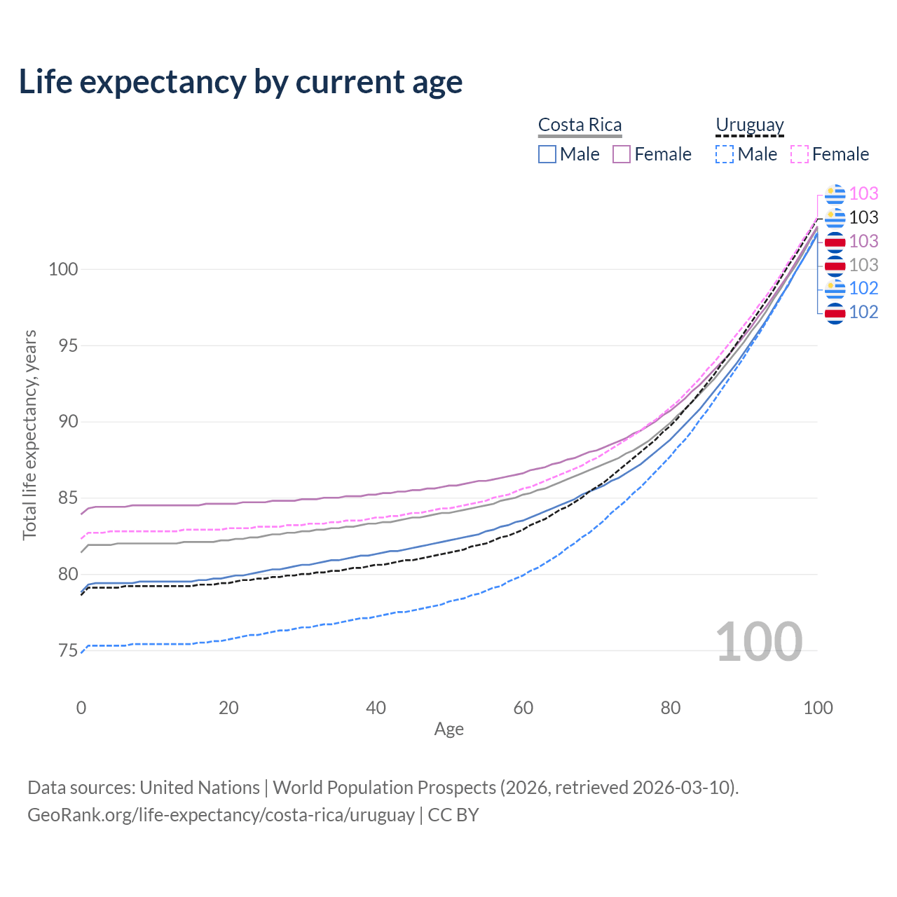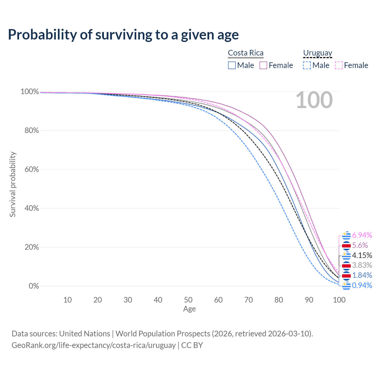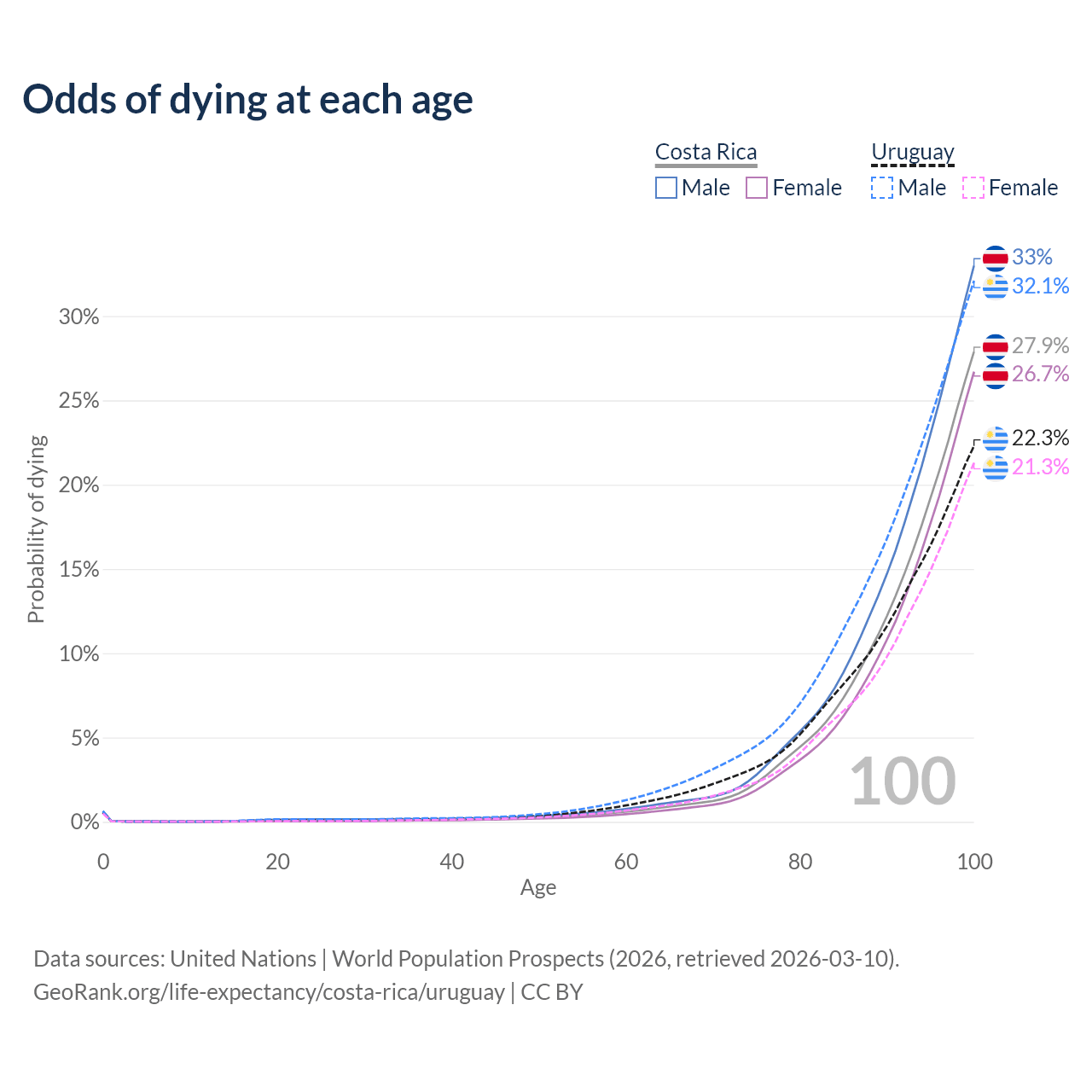This life expectancy calculator shows the odds of living to 100, 95, 90, and below based on current age for both males and females in Costa Rica and Uruguay, along with mean and median age of death. The calculations are based on the 2026 life tables (actuarial tables) from the UN World Population Prospects.