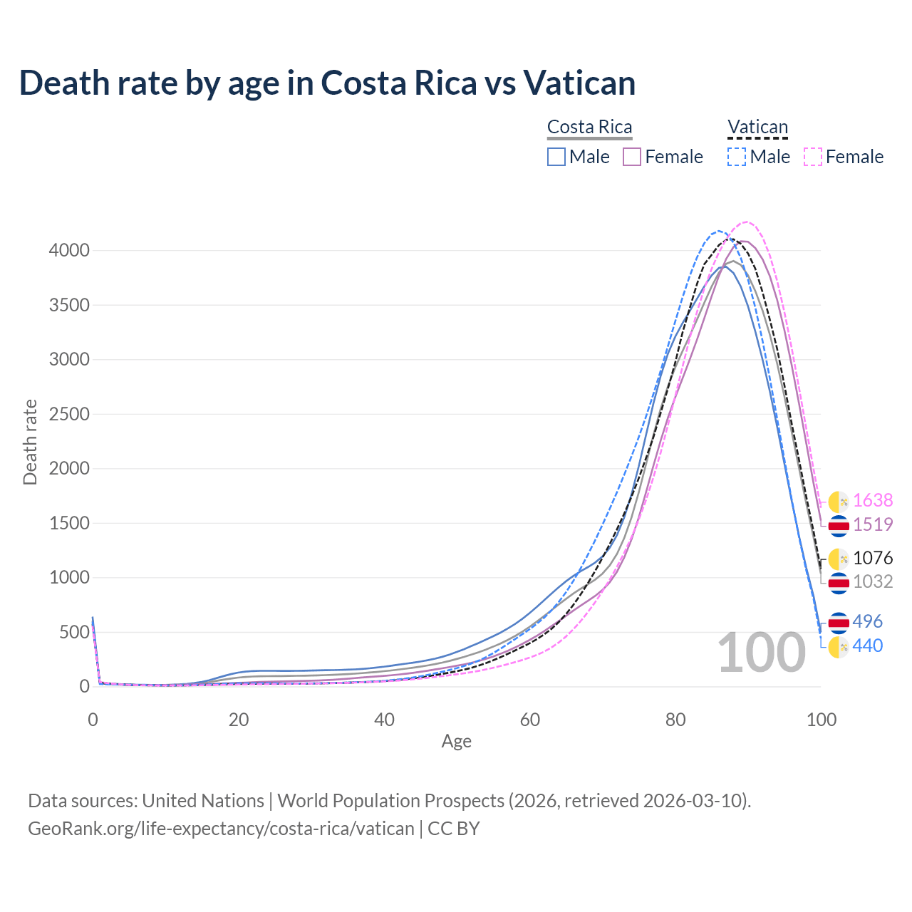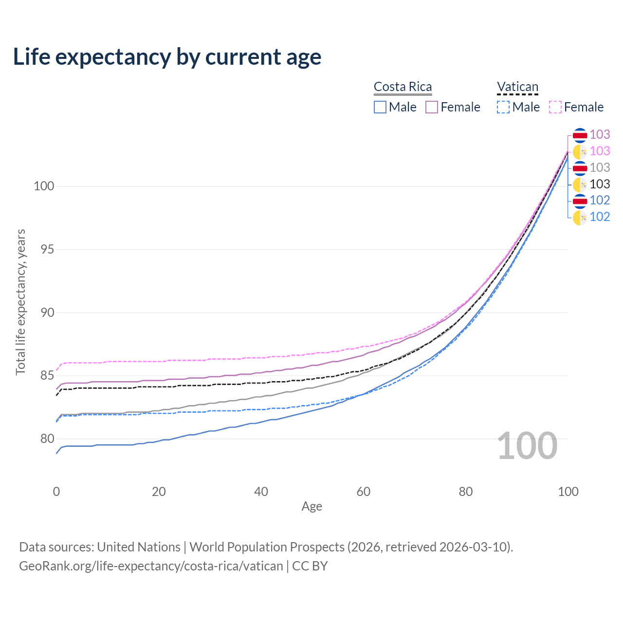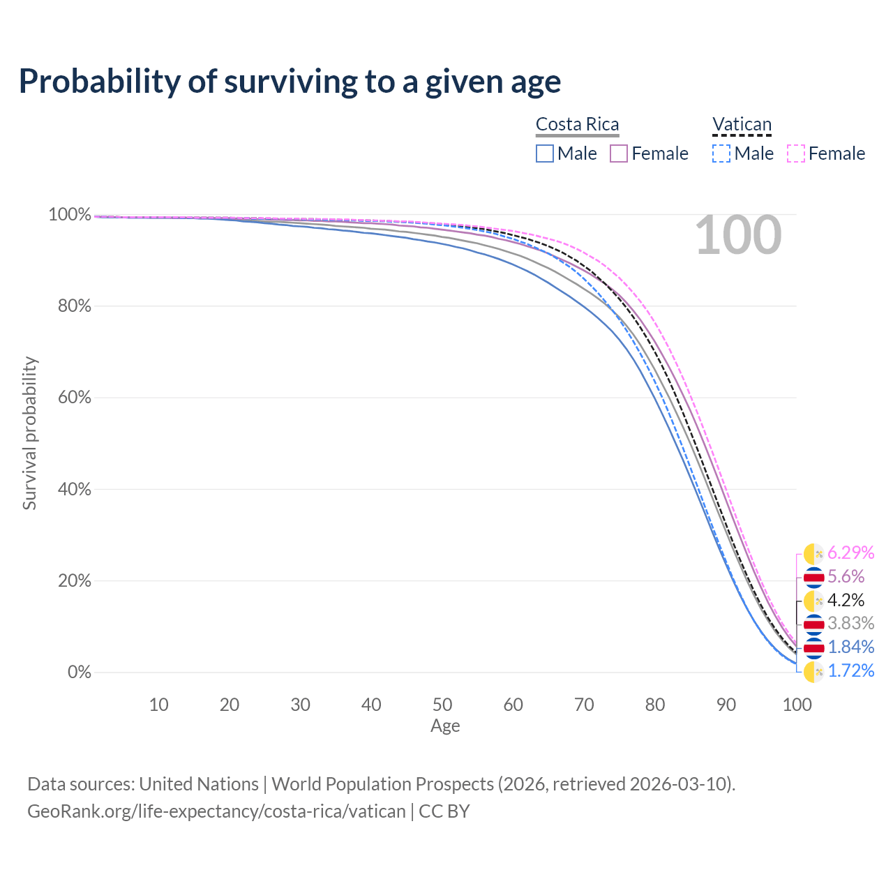 This life expectancy calculator shows the odds of living to 100, 95, 90, and below based on current age for both males and females in Costa Rica and the Vatican, along with mean and median age of death. The calculations are based on the 2026 life tables (actuarial tables) from the UN World Population Prospects.
