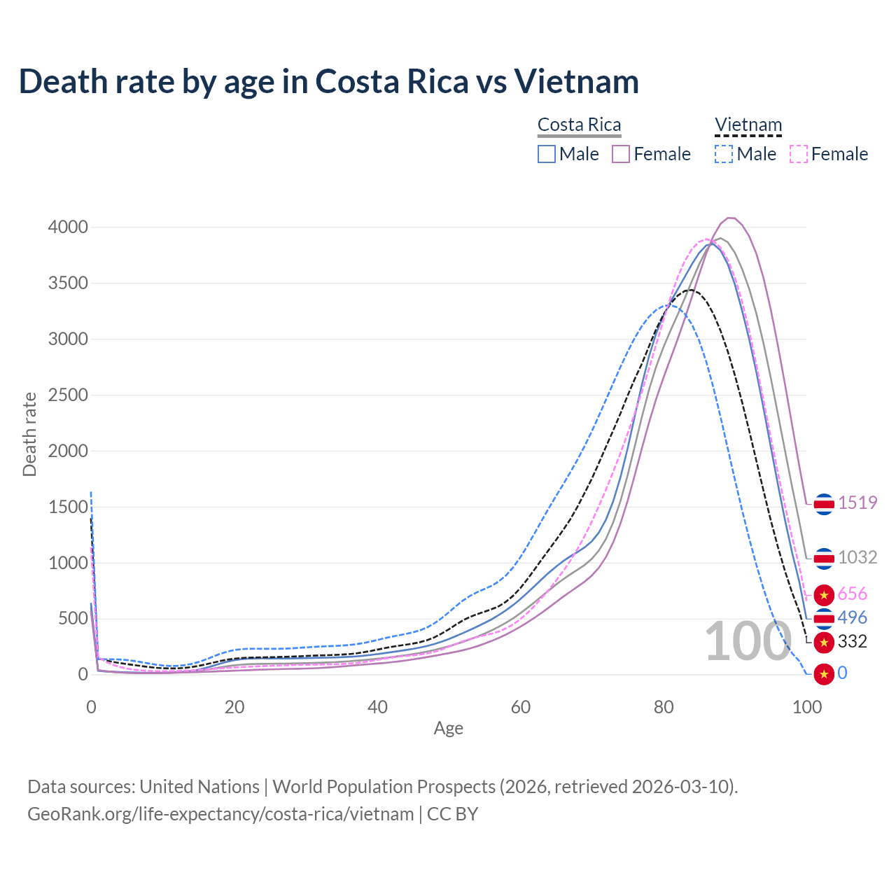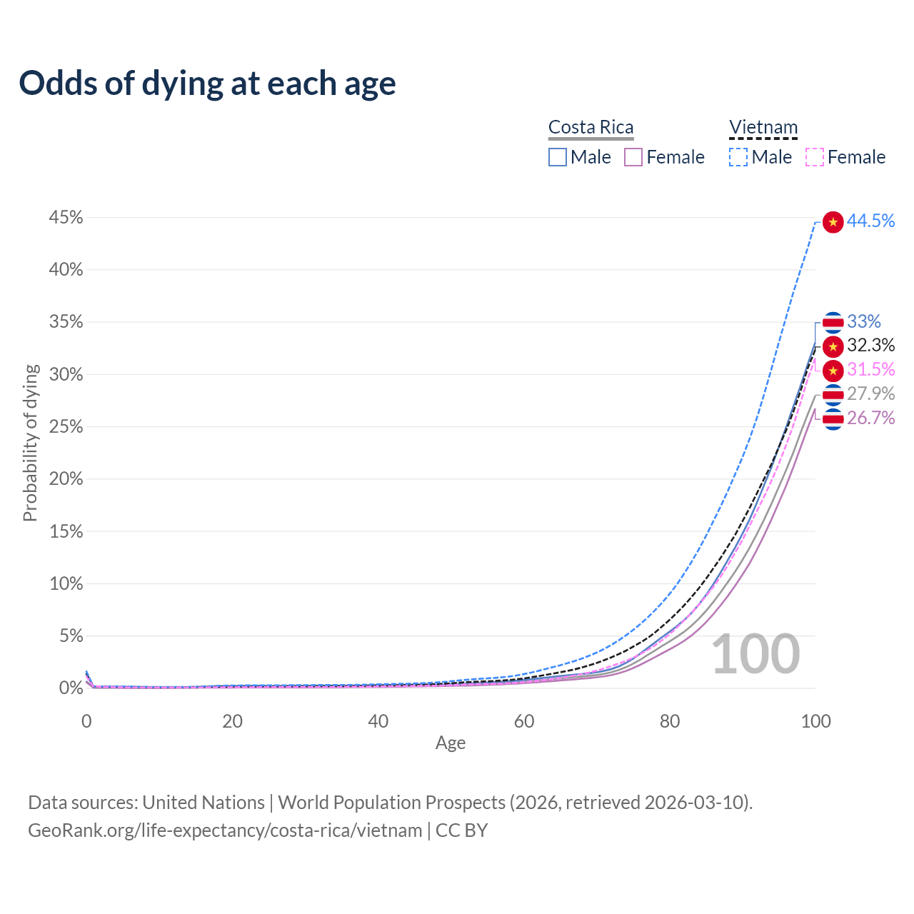 This life expectancy calculator shows the odds of living to 100, 95, 90, and below based on current age for both males and females in Costa Rica and Vietnam, along with mean and median age of death. The calculations are based on the 2026 life tables (actuarial tables) from the UN World Population Prospects.