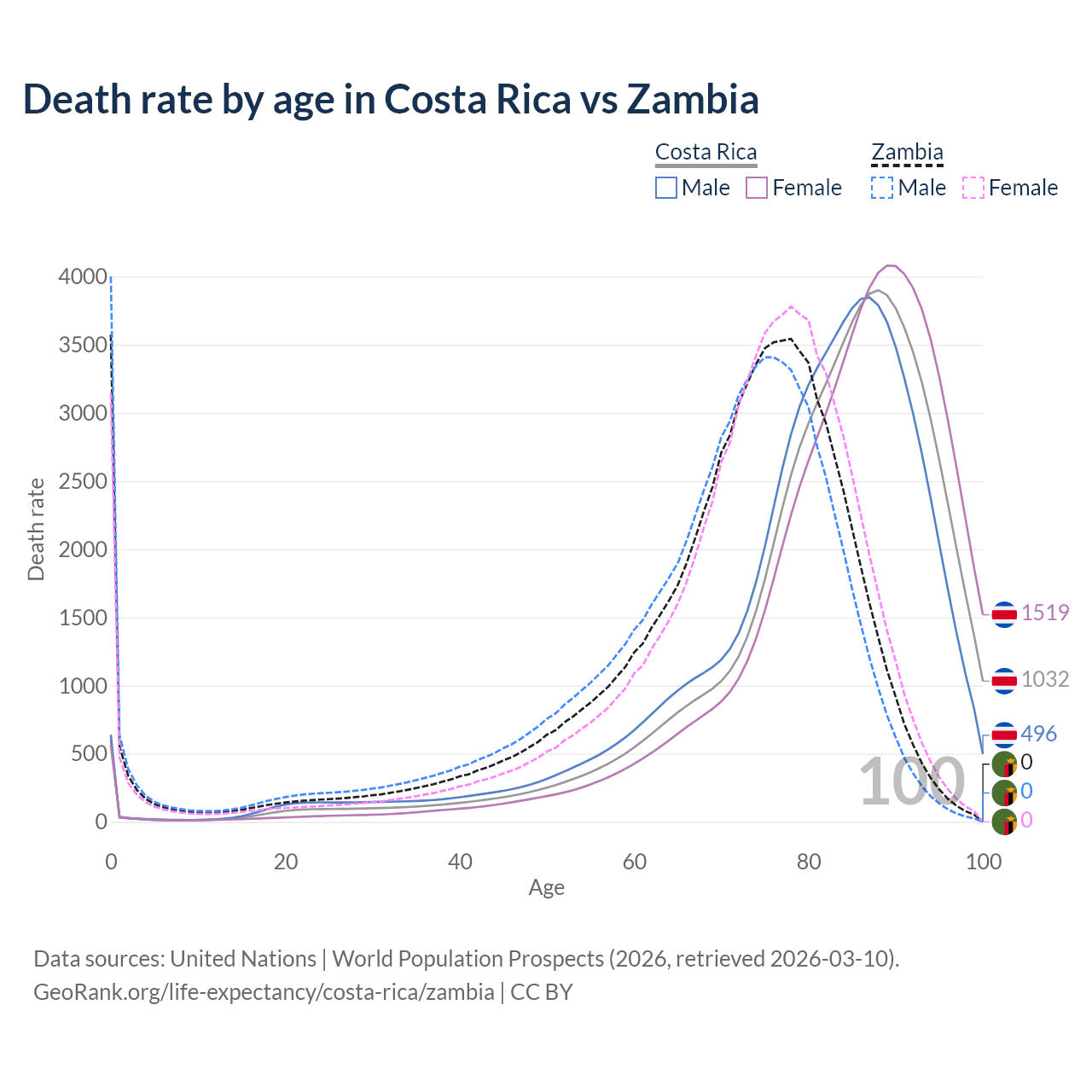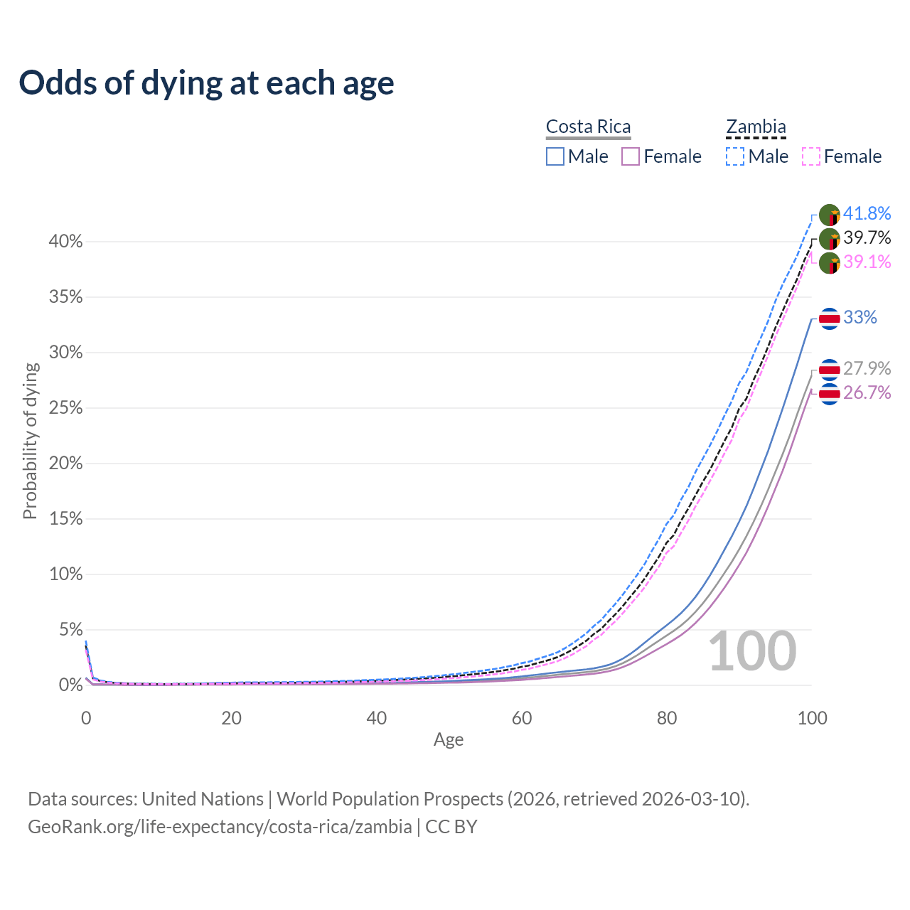 This life expectancy calculator shows the odds of living to 100, 95, 90, and below based on current age for both males and females in Costa Rica and Zambia, along with mean and median age of death. The calculations are based on the 2026 life tables (actuarial tables) from the UN World Population Prospects.