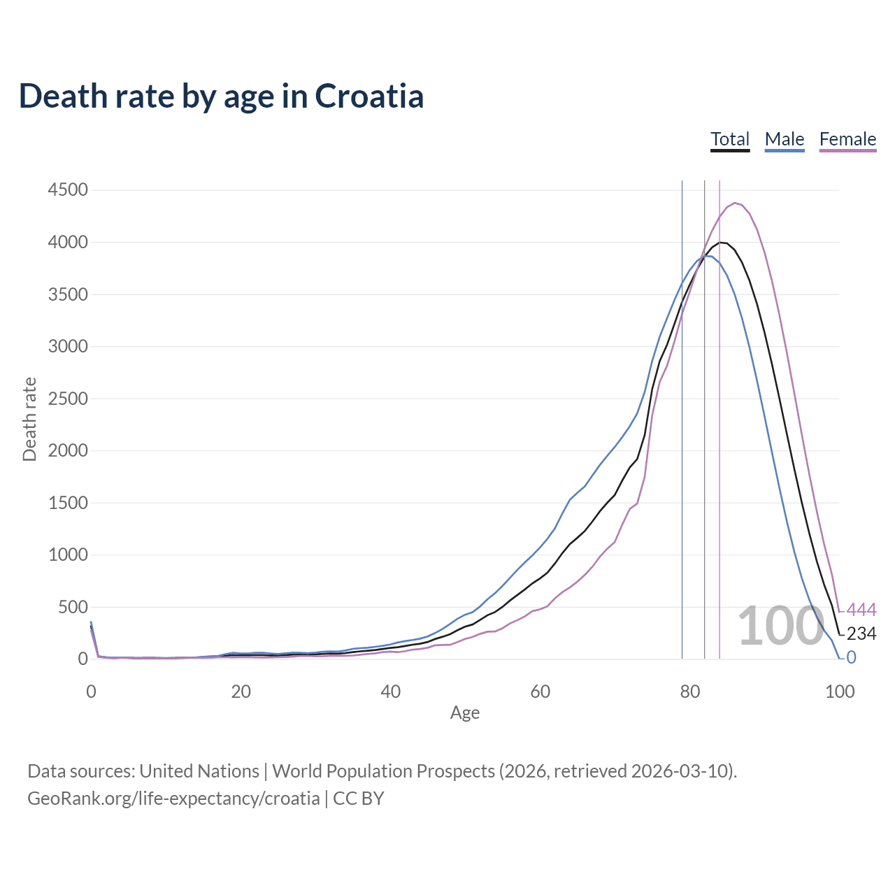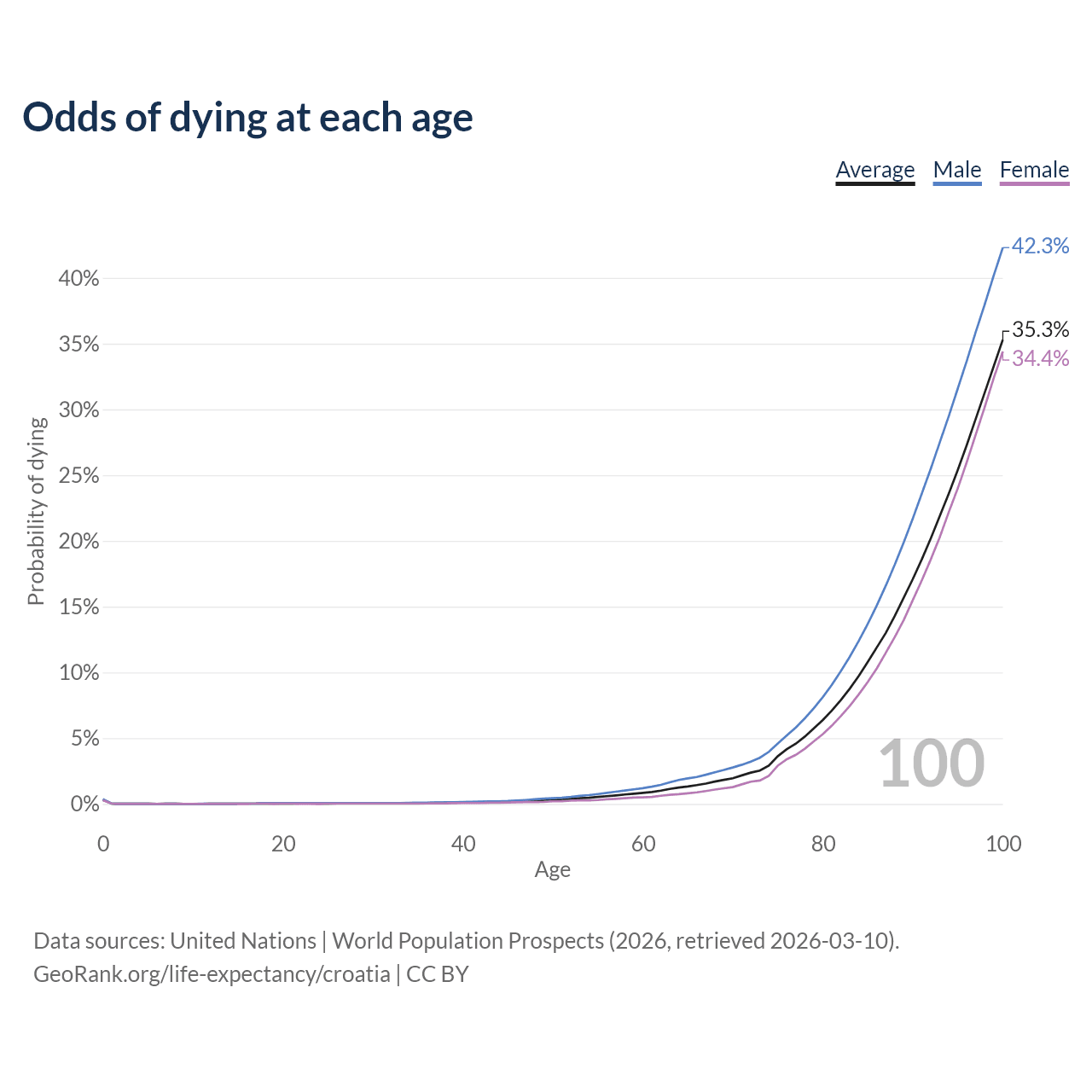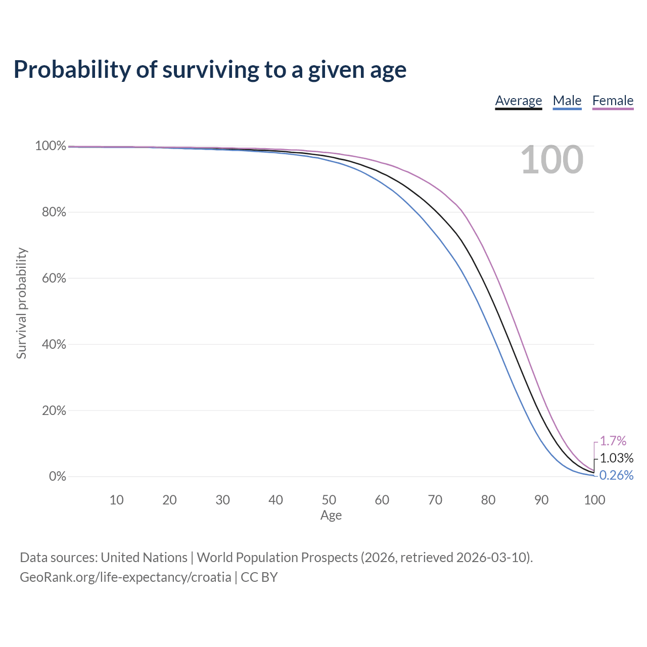 This life expectancy calculator shows the odds of living to 100, 95, 90, and below based on current age for both males and females in Croatia, along with mean and median age of death. The calculations are based on the 2026 life tables (actuarial tables) from the UN World Population Prospects.
