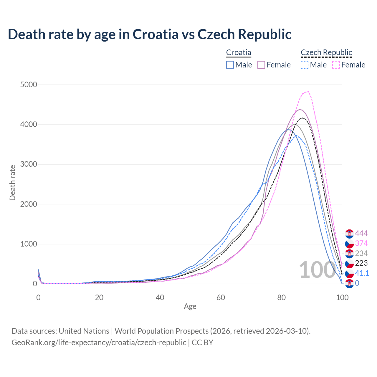 This life expectancy calculator shows the odds of living to 100, 95, 90, and below based on current age for both males and females in Croatia and the Czech Republic, along with mean and median age of death. The calculations are based on the 2026 life tables (actuarial tables) from the UN World Population Prospects.