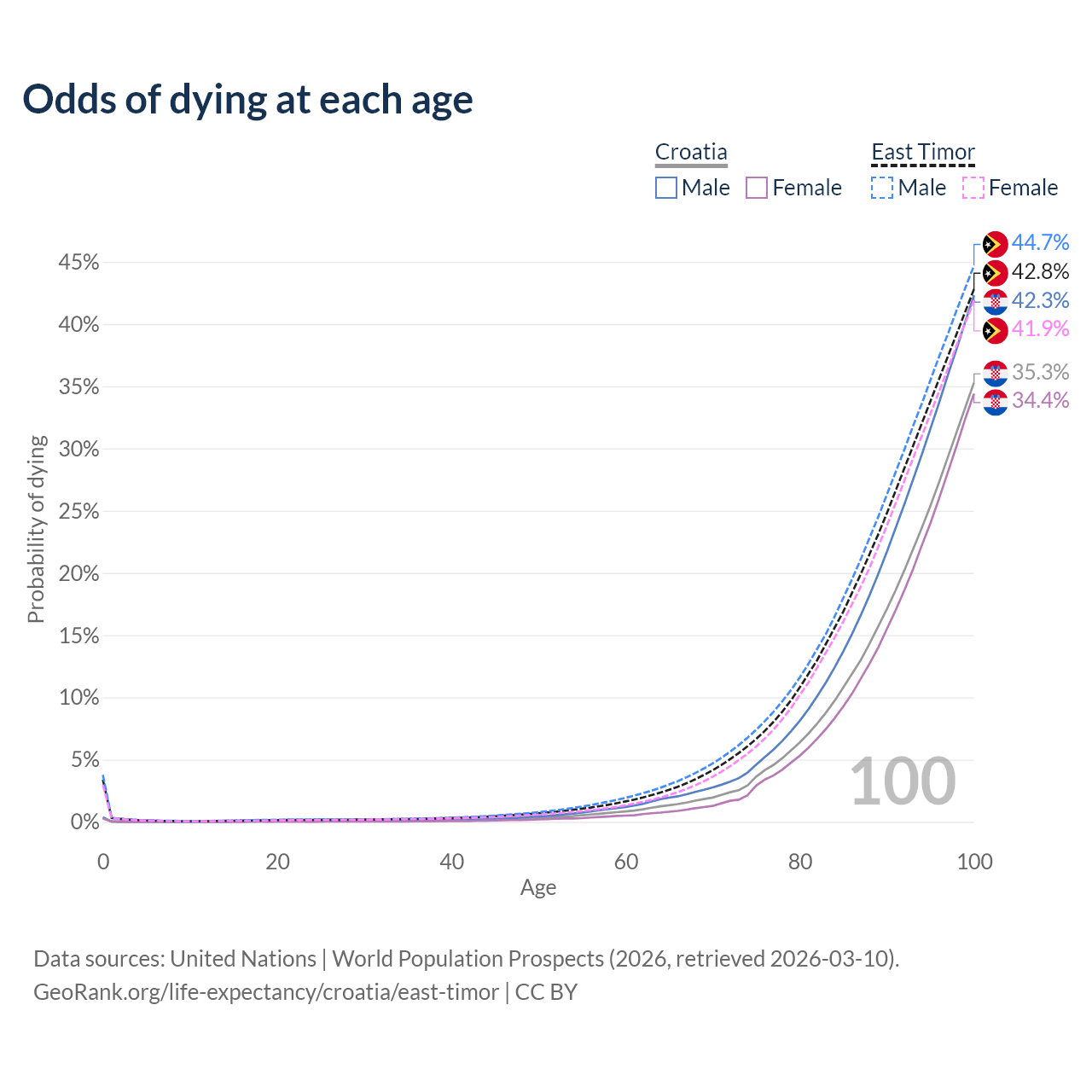 This life expectancy calculator shows the odds of living to 100, 95, 90, and below based on current age for both males and females in Croatia and East Timor, along with mean and median age of death. The calculations are based on the 2026 life tables (actuarial tables) from the UN World Population Prospects.